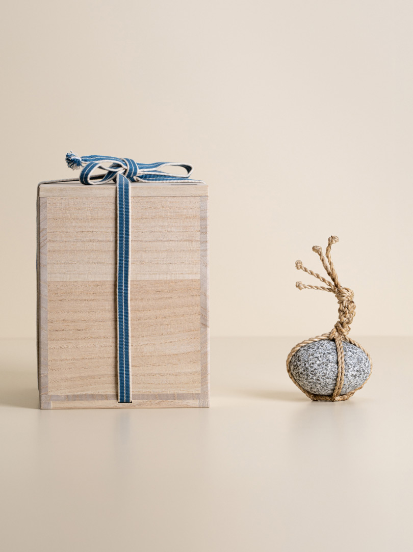 Each stone is delicately wrapped in washi paper, a traditional Japanese paper crafted from the elongated inner fibres of three plants: kozo, mitsumata and gampi. It is presented in a wooden box bearing the artisan’s signature mark. The box itself is made of Paulownia wood, known in East Asia as the ‘empress tree’ and valued for its lightweight but strong properties.