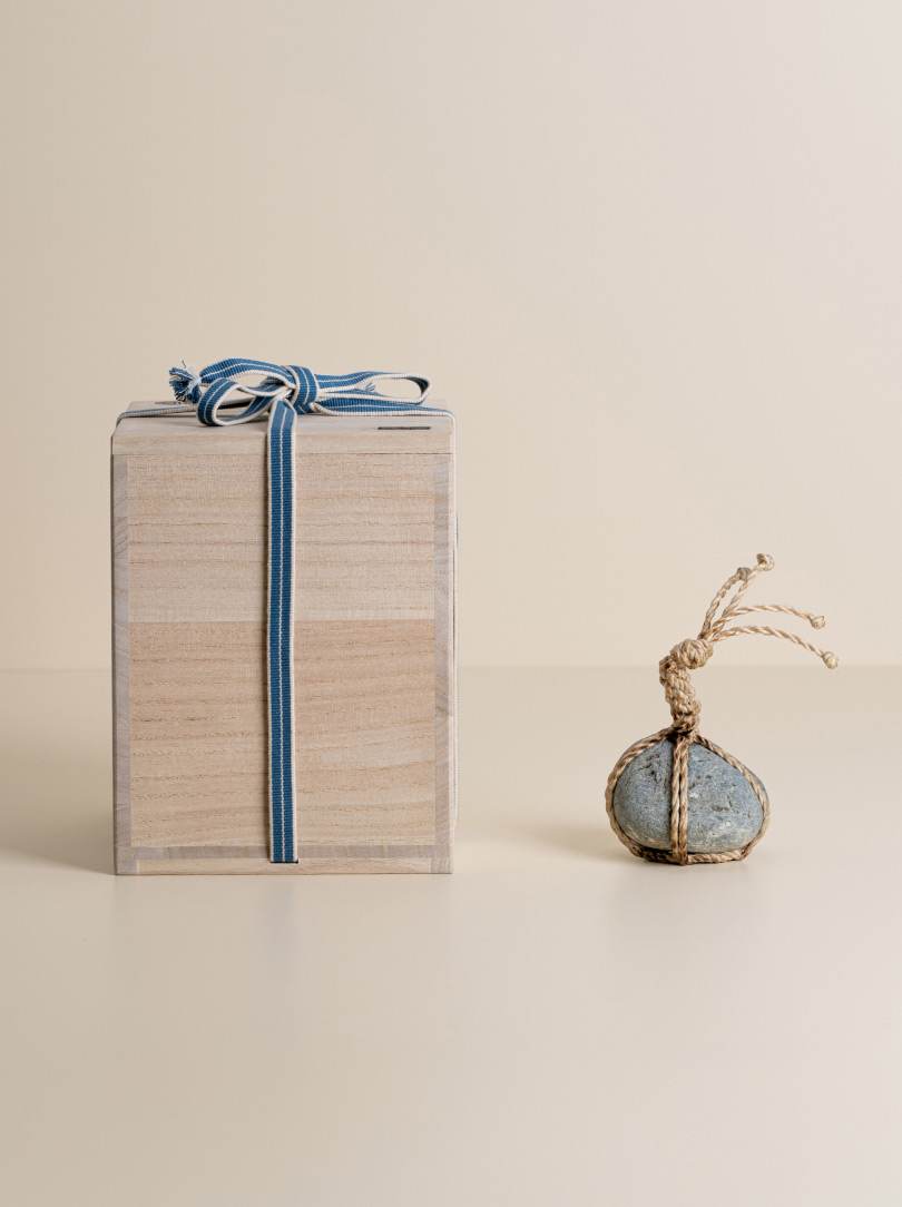 Each stone is delicately wrapped in washi paper, a traditional Japanese paper crafted from the elongated inner fibres of three plants: kozo, mitsumata and gampi. It is presented in a wooden box bearing the artisan’s signature mark. The box itself is made of Paulownia wood, known in East Asia as the ‘empress tree’ and valued for its lightweight but strong properties.