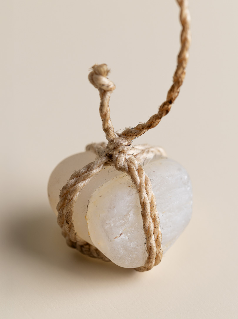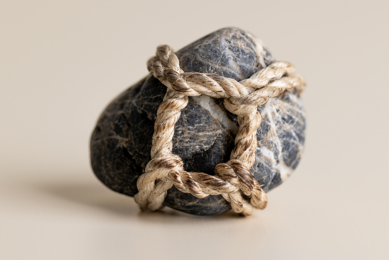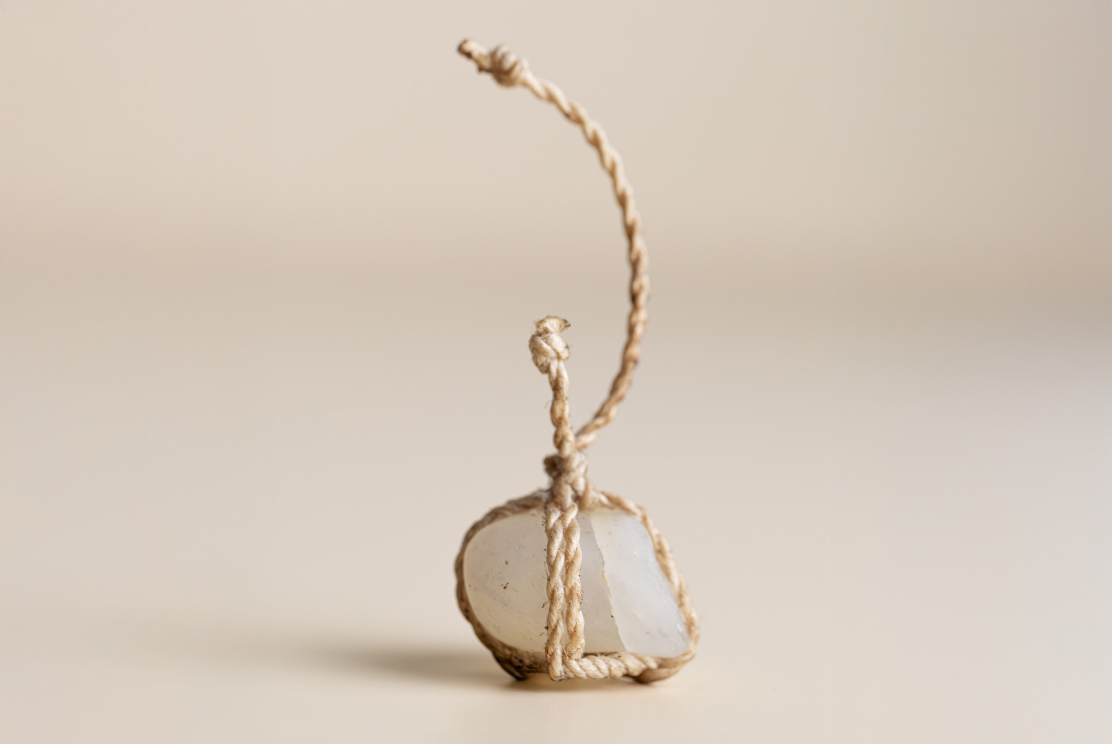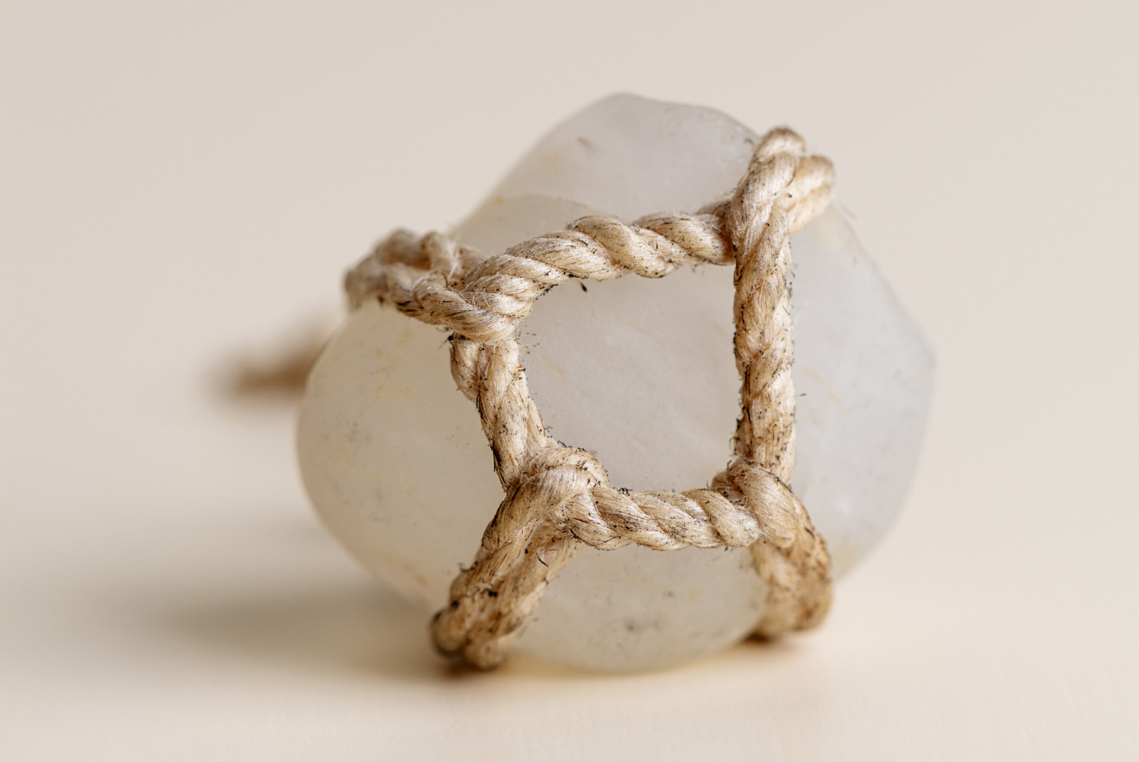 In the quietness of the dawn at one of Kyoto’s oldest Zen temples, Buddhist Zen monk Tosei Shinabe sits in deep meditation, practising ‘zazen’ (‘za’ 坐, Japanese for seated and ‘zen’ 禅 for meditation). His journey takes him to the mystical Awaji Island, the ‘land of birth’ in Japanese mythology, where he selects stones imbued with the earth‘s raw beauty. Wrapped in Seima rope made from the finest Japanese hemp, his ‘za kekkai’ stones serve as a silent testament, a Dharma tool, to the boundary between two spiritual realms, a line as delicate as it is profound.