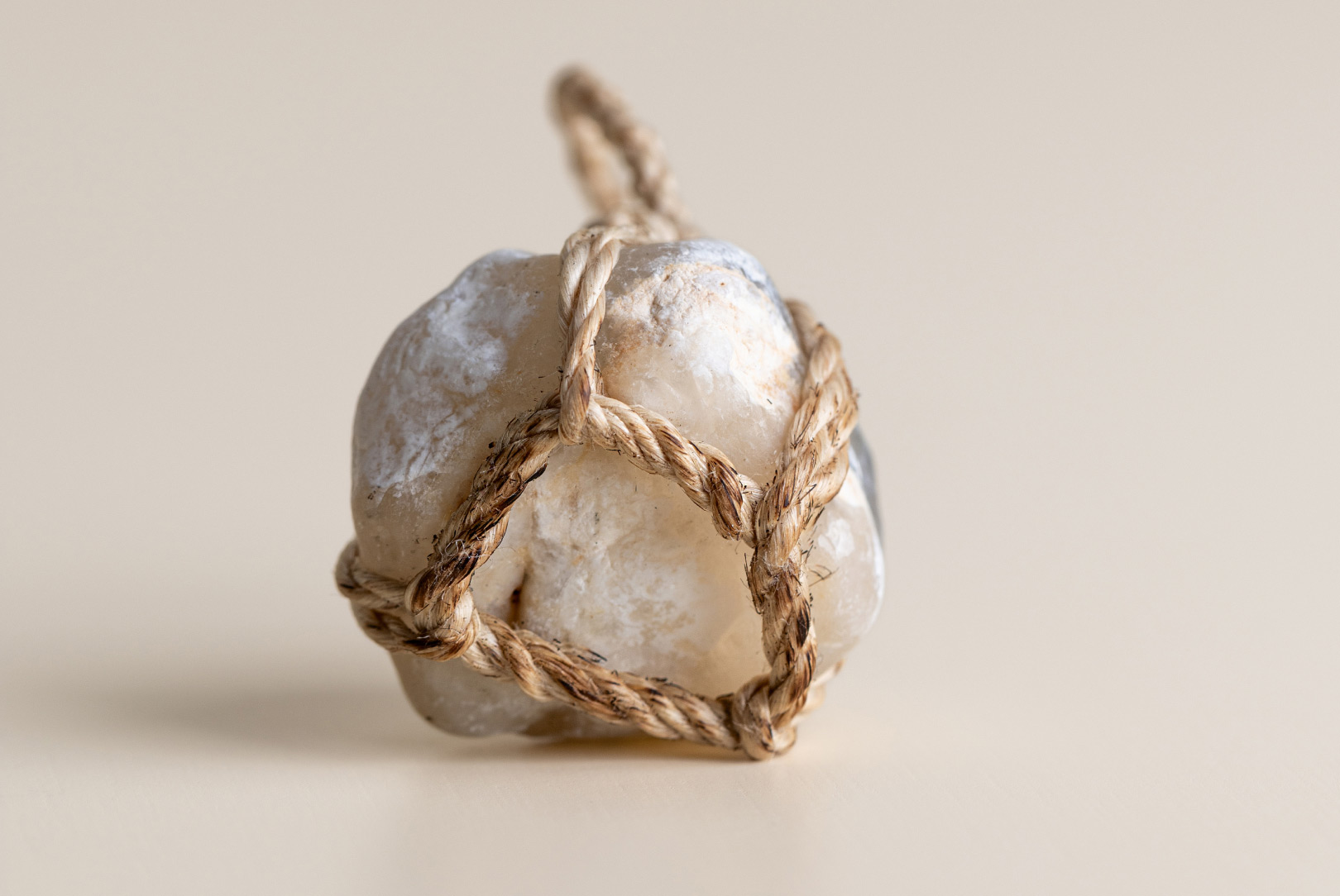 In the quietness of the dawn at one of Kyoto’s oldest Zen temples, Buddhist Zen monk Tosei Shinabe sits in deep meditation, practising ‘zazen’ (‘za’ 坐, Japanese for seated and ‘zen’ 禅 for meditation). His journey takes him to the mystical Awaji Island, the ‘land of birth’ in Japanese mythology, where he selects stones imbued with the earth‘s raw beauty. Wrapped in Seima rope made from the finest Japanese hemp, his ‘za kekkai’ stones serve as a silent testament, a Dharma tool, to the boundary between two spiritual realms, a line as delicate as it is profound.