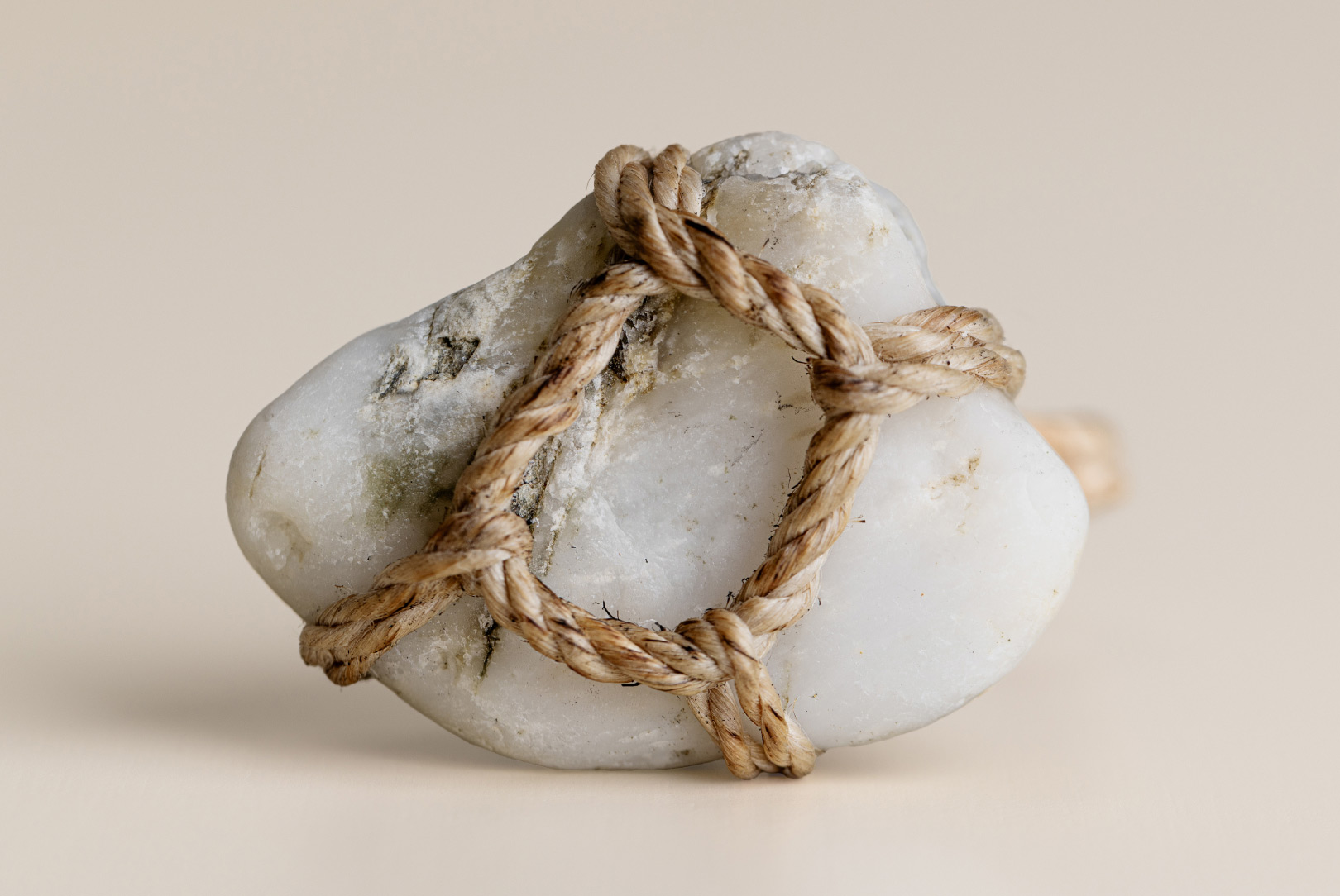In the quietness of the dawn at one of Kyoto’s oldest Zen temples, Buddhist Zen monk Tosei Shinabe sits in deep meditation, practising ‘zazen’ (‘za’ 坐, Japanese for seated and ‘zen’ 禅 for meditation). His journey takes him to the mystical Awaji Island, the ‘land of birth’ in Japanese mythology, where he selects stones imbued with the earth‘s raw beauty. Wrapped in Seima rope made from the finest Japanese hemp, his ‘za kekkai’ stones serve as a silent testament, a Dharma tool, to the boundary between two spiritual realms, a line as delicate as it is profound.