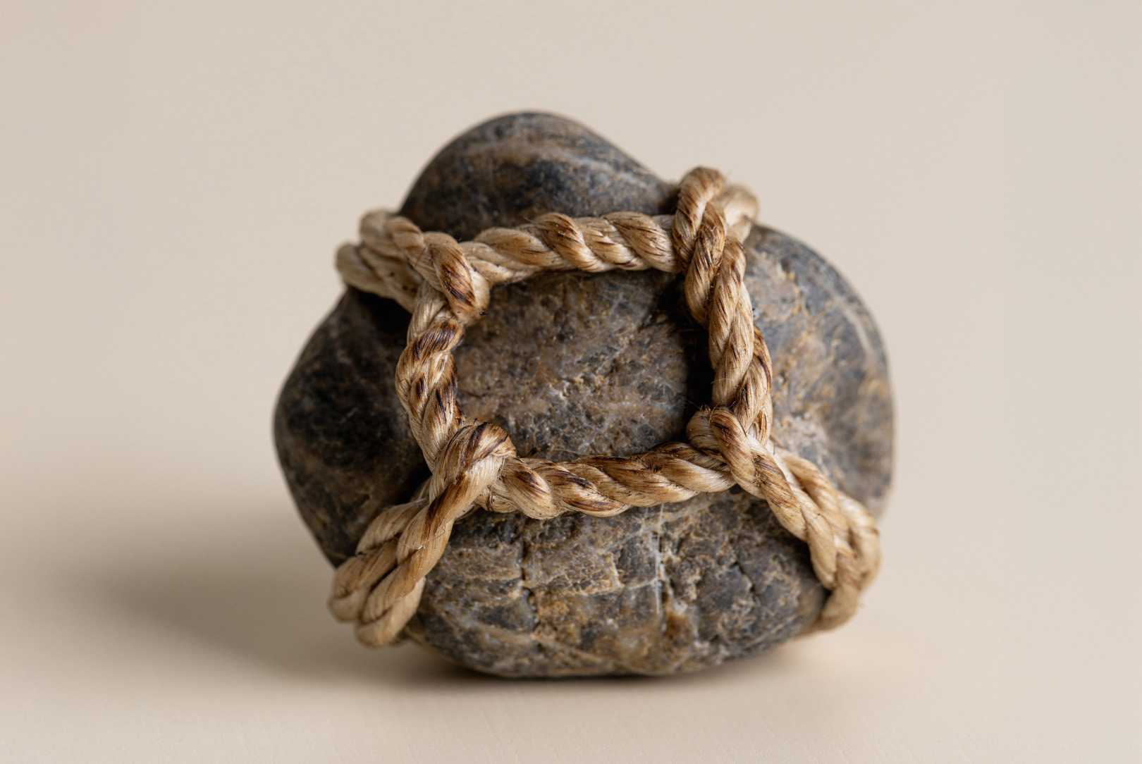 In the quietness of the dawn at one of Kyoto’s oldest Zen temples, Buddhist Zen monk Tosei Shinabe sits in deep meditation, practising ‘zazen’ (‘za’ 坐, Japanese for seated and ‘zen’ 禅 for meditation). His journey takes him to the mystical Awaji Island, the ‘land of birth’ in Japanese mythology, where he selects stones imbued with the earth‘s raw beauty. Wrapped in Seima rope made from the finest Japanese hemp, his ‘za kekkai’ stones serve as a silent testament, a Dharma tool, to the boundary between two spiritual realms, a line as delicate as it is profound.