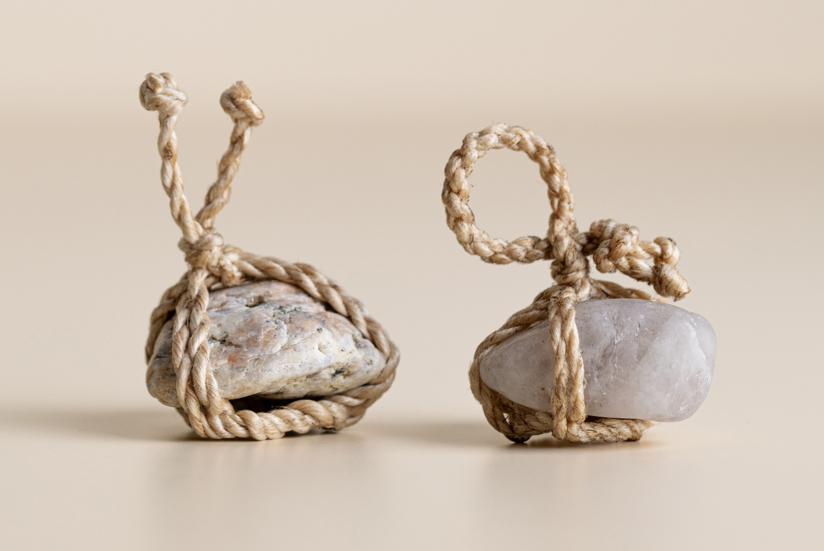 In the quietness of the dawn at one of Kyoto’s Zen temples, Buddhist Zen monk Tosei Shinabe sits in deep meditation, practising ‘zazen’ (‘za’ 坐, Japanese for seated and ‘zen’ 禅 for meditation). His journey takes him to the mystical Awaji Island, the ‘land of birth’ in Japanese mythology, where he selects stones imbued with the earth‘s raw beauty. Wrapped in Seima rope made from the finest Japanese hemp, his ‘za kekkai’ stones serve as a silent testament, a Dharma tool, to the boundary between two spiritual realms, a line as delicate as it is profound.