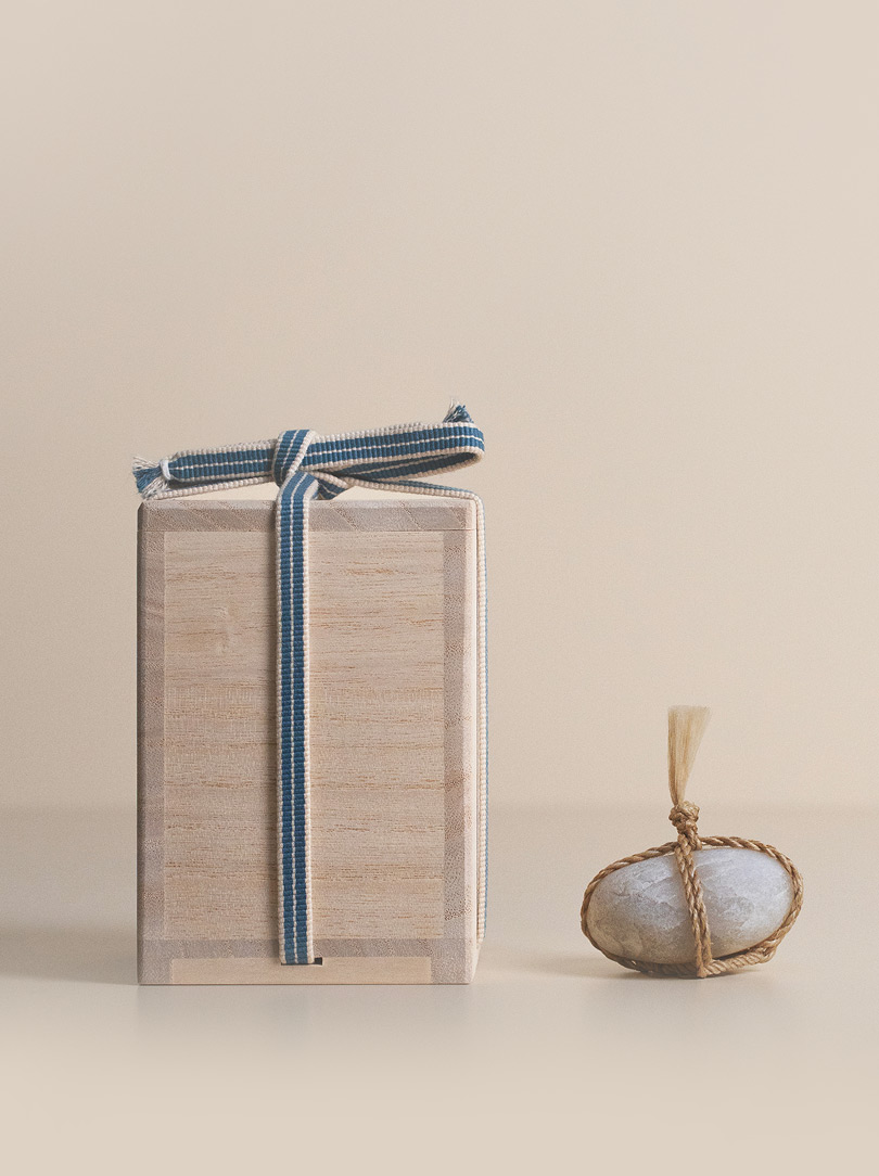 Each stone is delicately wrapped in washi paper, a traditional Japanese paper crafted from the elongated inner fibres of three plants: kozo, mitsumata and gampi. It is presented in a wooden box bearing the artisan’s signature mark. The box itself is made of Paulownia wood, known in East Asia as the ‘empress tree’ and valued for its lightweight but strong properties.