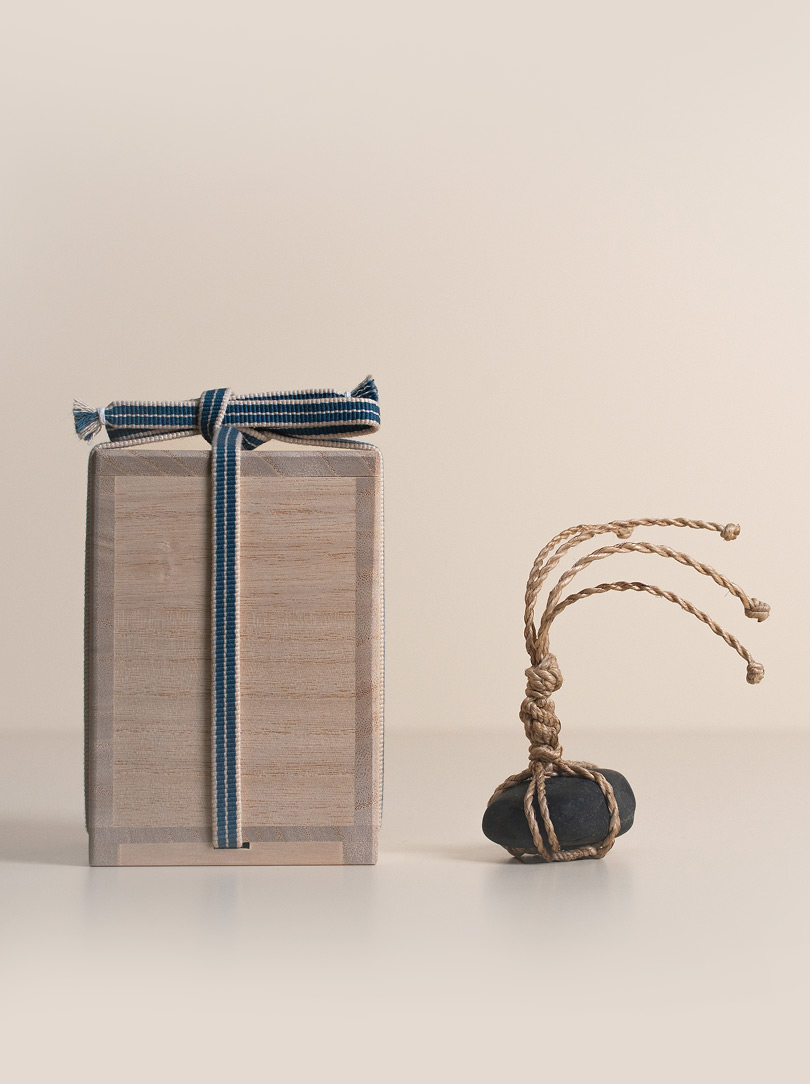 Each stone is delicately wrapped in washi paper, a traditional Japanese paper crafted from the elongated inner fibres of three plants: kozo, mitsumata and gampi. It is presented in a wooden box bearing the artisan’s signature mark. The box itself is made of Paulownia wood, known in East Asia as the ‘empress tree’ and valued for its lightweight but strong properties.