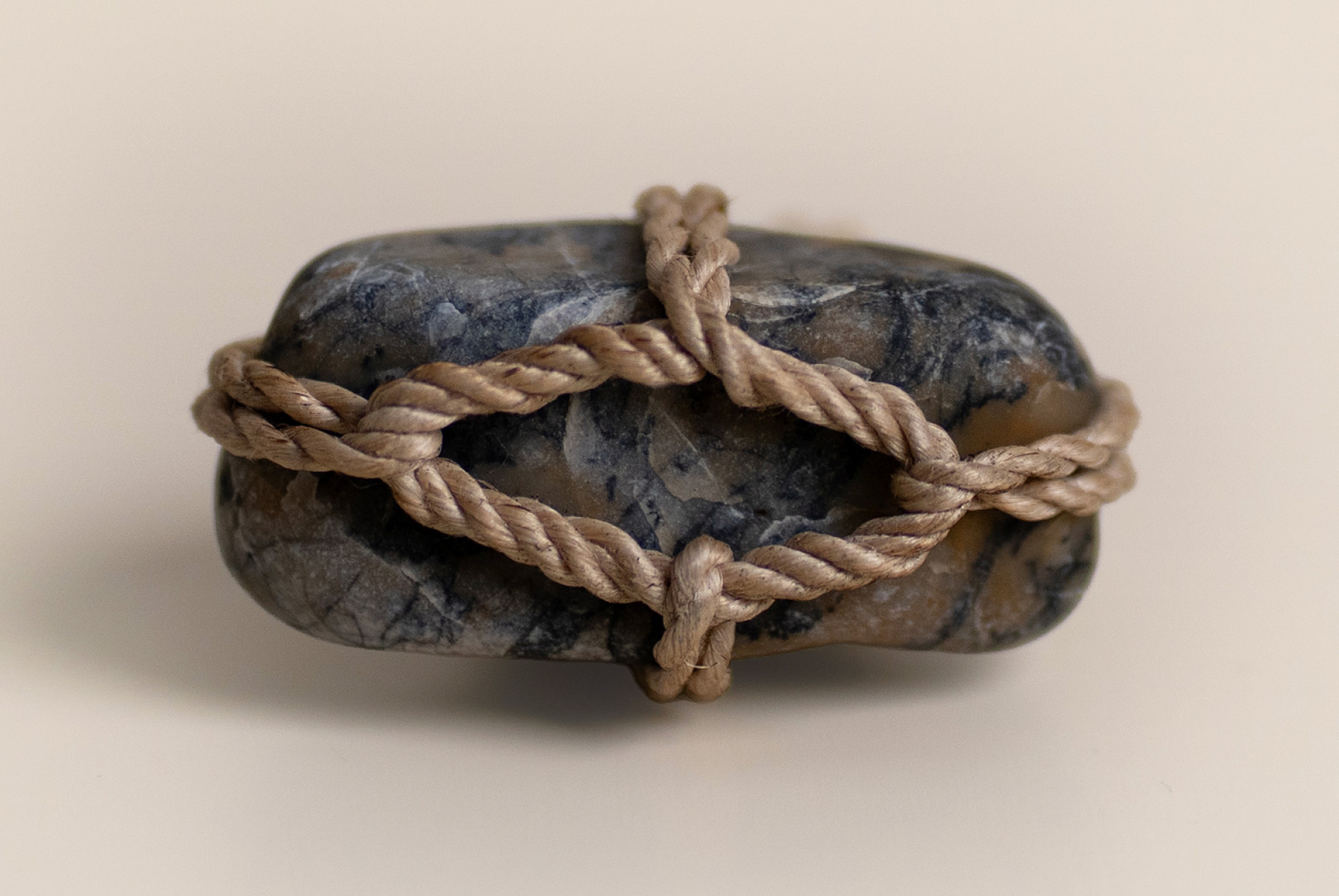 In the quietness of the dawn at one of Kyoto’s oldest Zen temples, Buddhist Zen monk Tosei Shinabe sits in deep meditation, practising ‘zazen’ (‘za’ 坐, Japanese for seated and ‘zen’ 禅 for meditation). His journey takes him to the mystical Awaji Island, the ‘land of birth’ in Japanese mythology, where he selects stones imbued with the earth‘s raw beauty. Wrapped in Seima rope made from the finest Japanese hemp, his za kekkai stones serve as a silent testament, a Dharma tool, to the boundary between two spiritual realms, a line as delicate as it is profound.