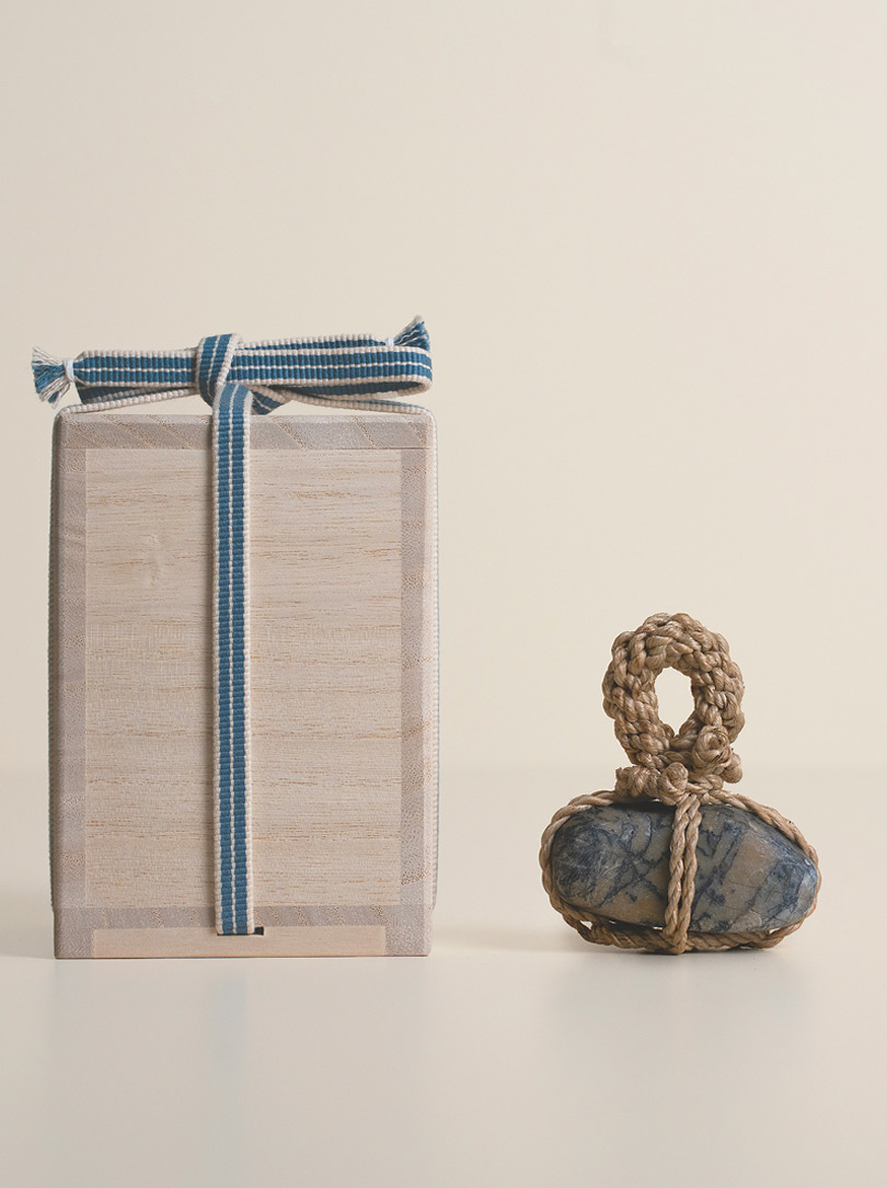 Each stone is delicately wrapped in washi paper, a traditional Japanese paper crafted from the elongated inner fibres of three plants: kozo, mitsumata and gampi. It is presented in a wooden box bearing the artisan’s signature mark. The box itself is made of Paulownia wood, known in East Asia as the ‘empress tree’ and valued for its lightweight but strong properties.