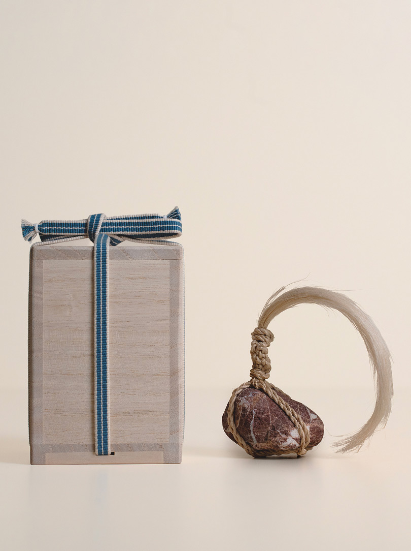 Each stone is delicately wrapped in washi paper, a traditional Japanese paper crafted from the elongated inner fibres of three plants: kozo, mitsumata and gampi. It is presented in a wooden box bearing the artisan’s signature mark. The box itself is made of Paulownia wood, known in East Asia as the ‘empress tree’ and valued for its lightweight but strong properties.