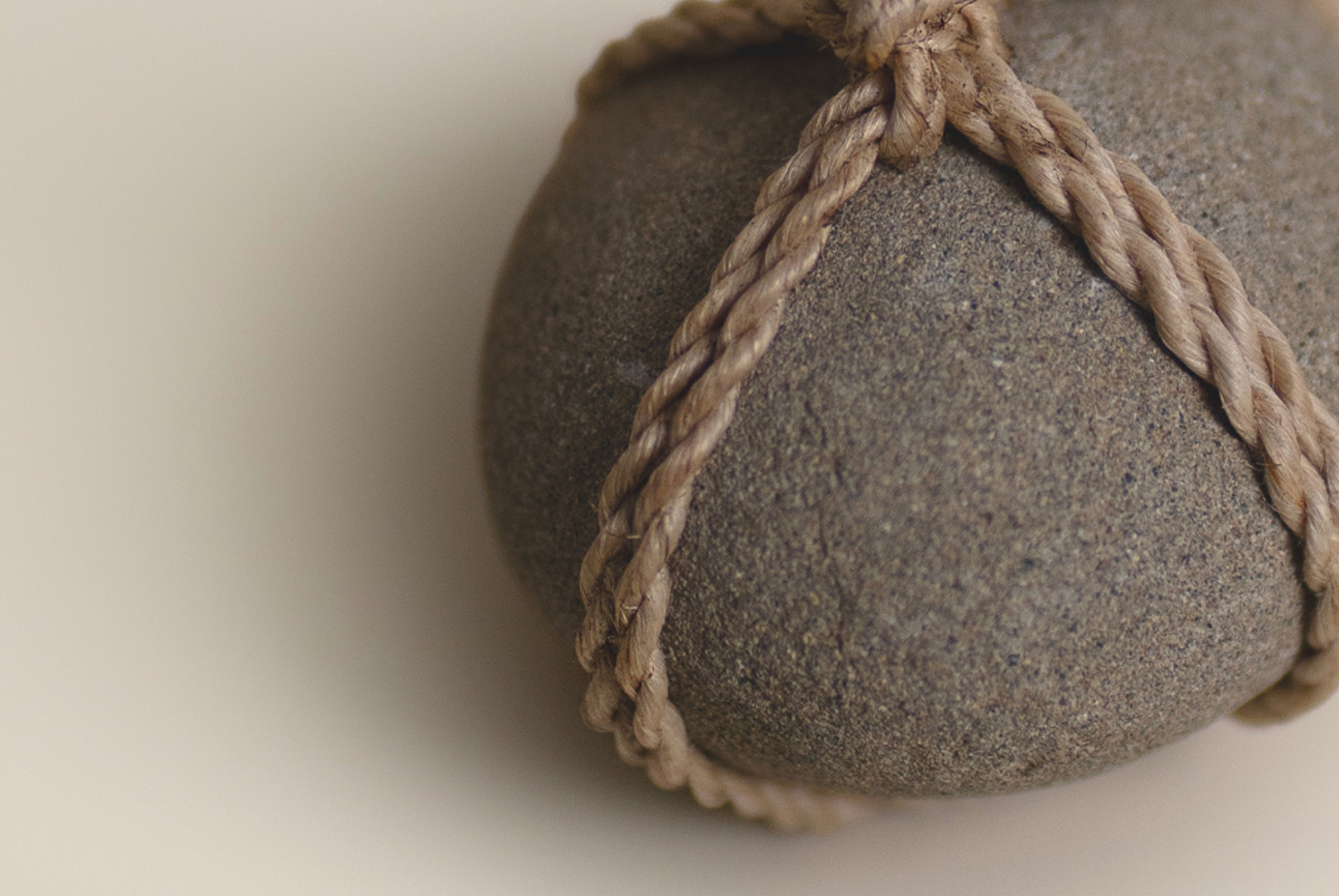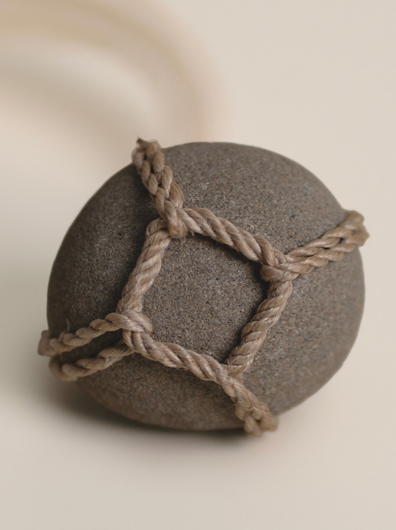 AGOBAY Showroom ZurichOften used in Japanese temples and tea houses, kekkai stones are crafted with intention. They are not merely objects but keepers of spiritual wisdom, echoing the Zen philosophy that ‘heaven, earth and I all share the same origin, and are therefore one’. In Japan, this has led to a spirit of respect for nature and a desire to live in harmony with it since ancient times. The tactile roughness of the stone and the smooth strength of the hemp invite one to ponder the interconnectedness of our existence with nature.