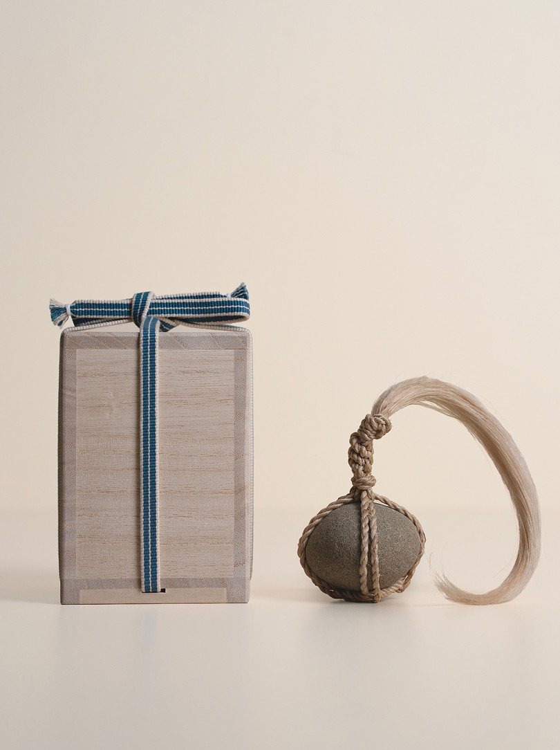 Each stone is delicately wrapped in washi paper, a traditional Japanese paper crafted from the elongated inner fibres of three plants: kozo, mitsumata and gampi. It is presented in a wooden box bearing the artisan’s signature mark. The box itself is made of Paulownia wood, known in East Asia as the ‘empress tree’ and valued for its lightweight but strong properties.