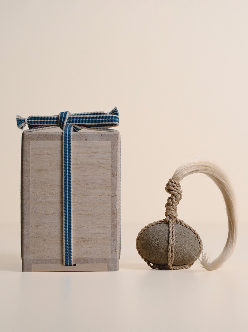 Each stone is delicately wrapped in washi paper, a traditional Japanese paper crafted from the elongated inner fibres of three plants: kozo, mitsumata and gampi. It is presented in a wooden box bearing the artisan’s signature mark. The box itself is made of Paulownia wood, known in East Asia as the ‘empress tree’ and valued for its lightweight but strong properties.