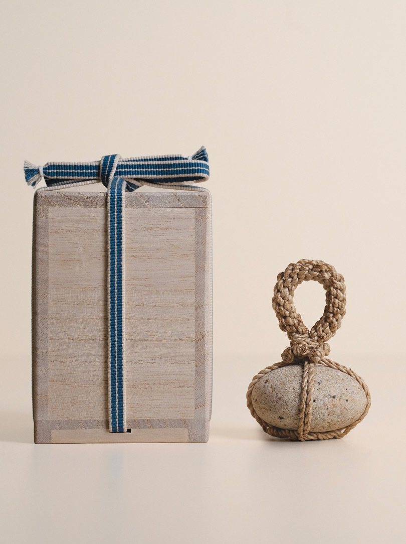 Each stone is delicately wrapped in washi paper, a traditional Japanese paper crafted from the elongated inner fibres of three plants: kozo, mitsumata and gampi. It is presented in a wooden box bearing the artisan’s signature mark. The box itself is made of Paulownia wood, known in East Asia as the ‘empress tree’ and valued for its lightweight but strong properties.
