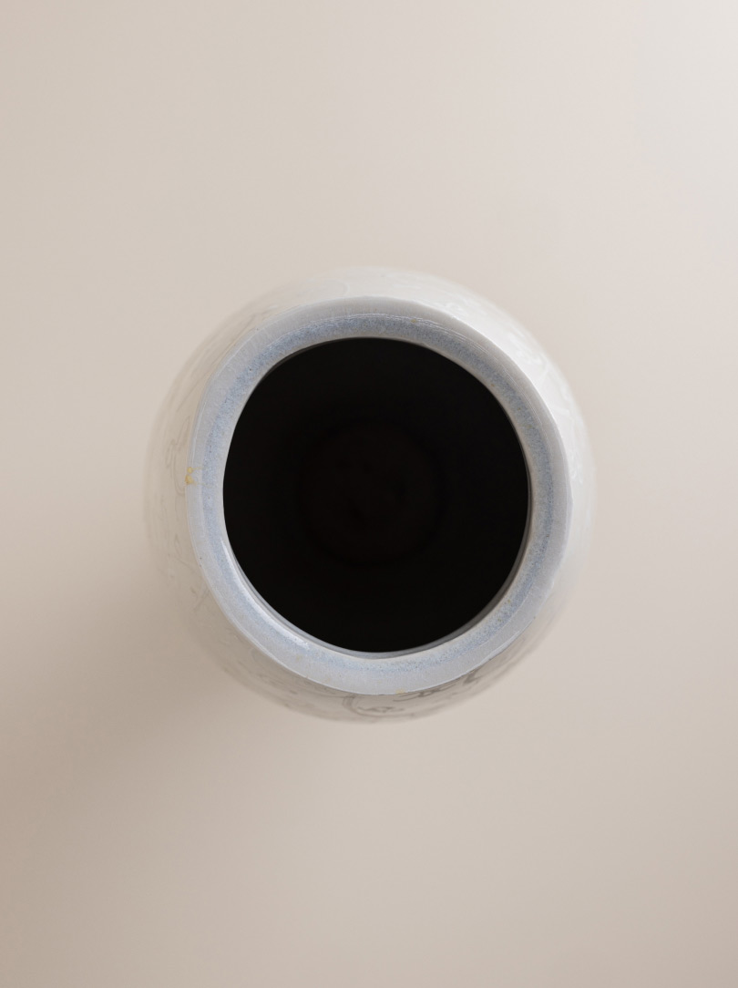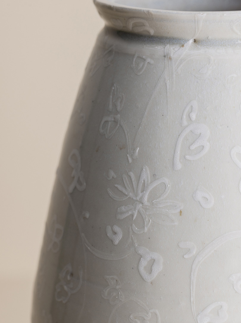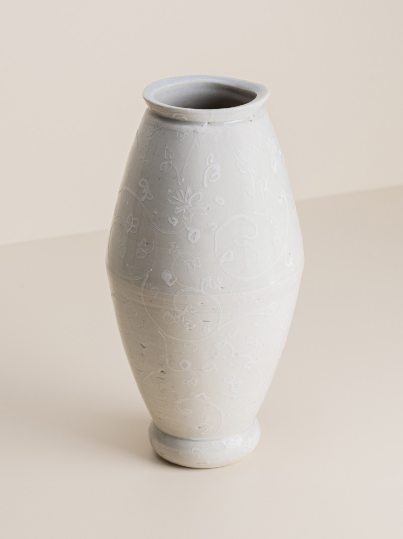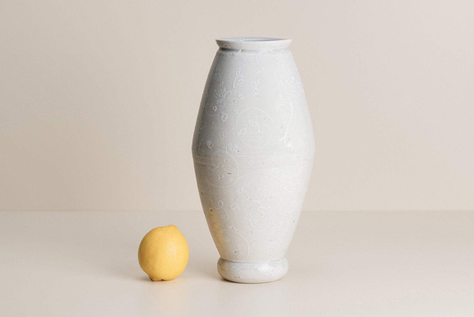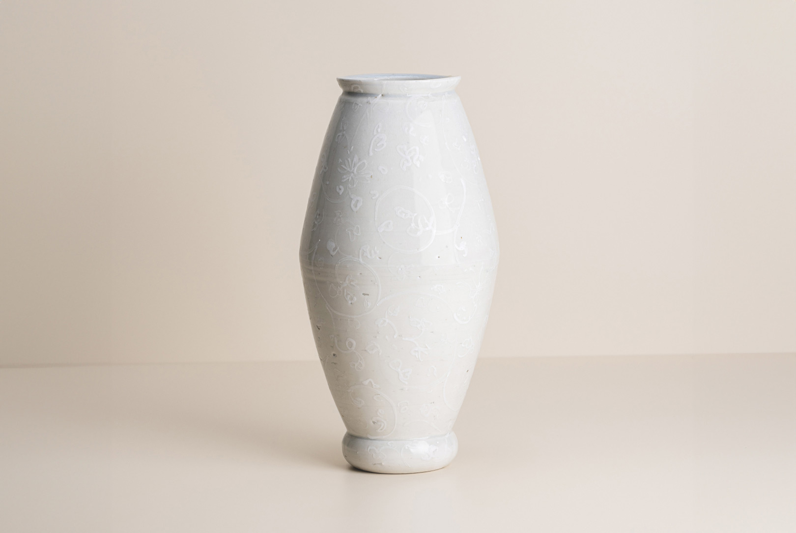 Inspired by ancient European architectural columns, the shape of this elongated vase is almost a mirror image of itself. The white floral pattern creates depth against the cream base, while the white glazing is in the Korean Yi Dynasty style. The artist, Shingo Oka, spent a five-year period tracing the history of Japanese ceramics, which also led to exploring the origin of ceramicware from neighbouring countries.