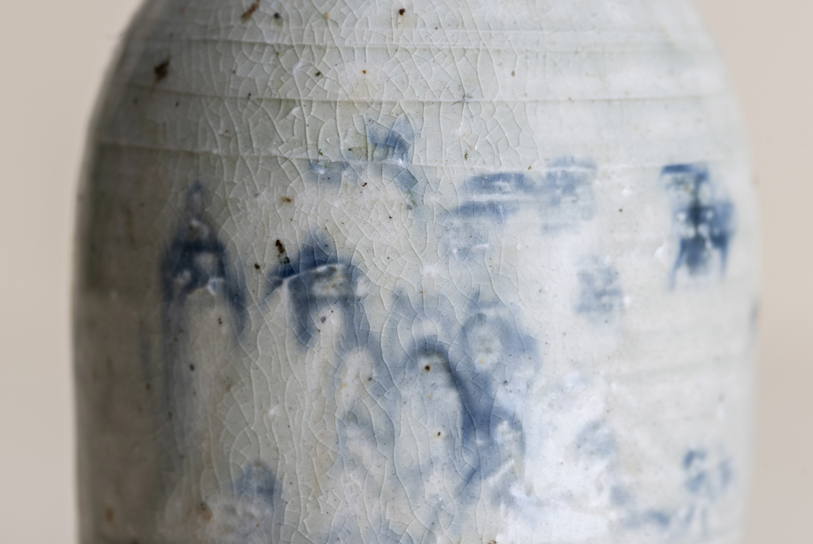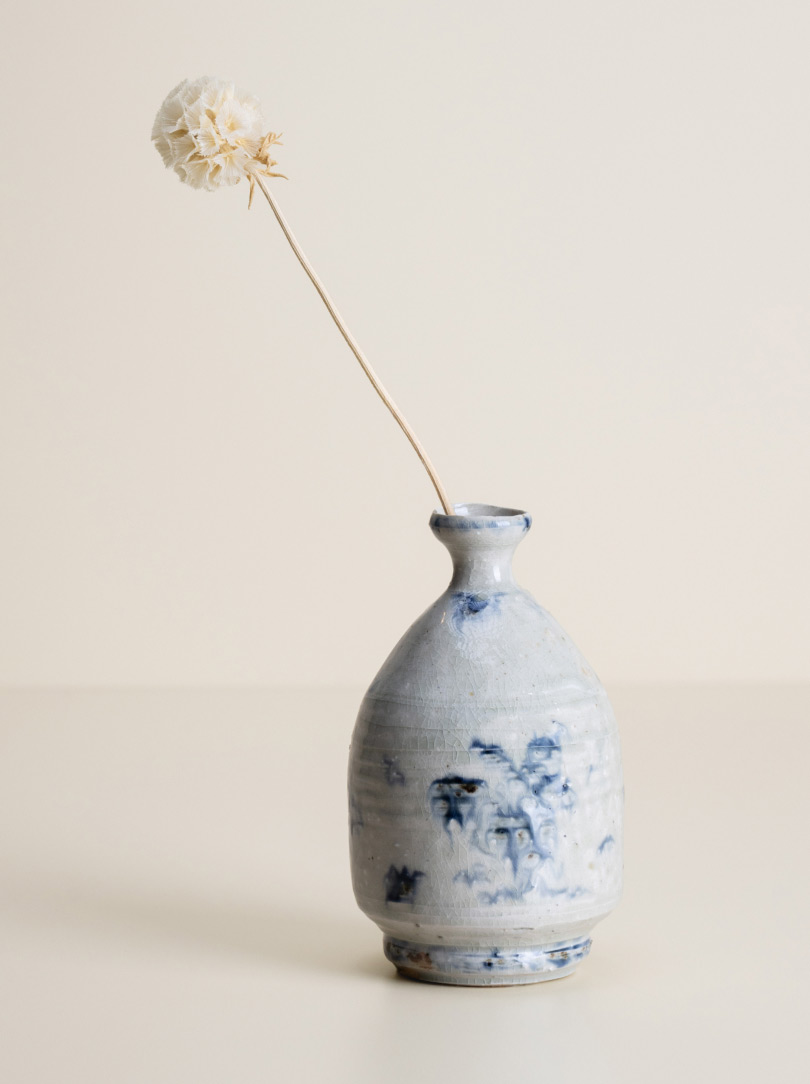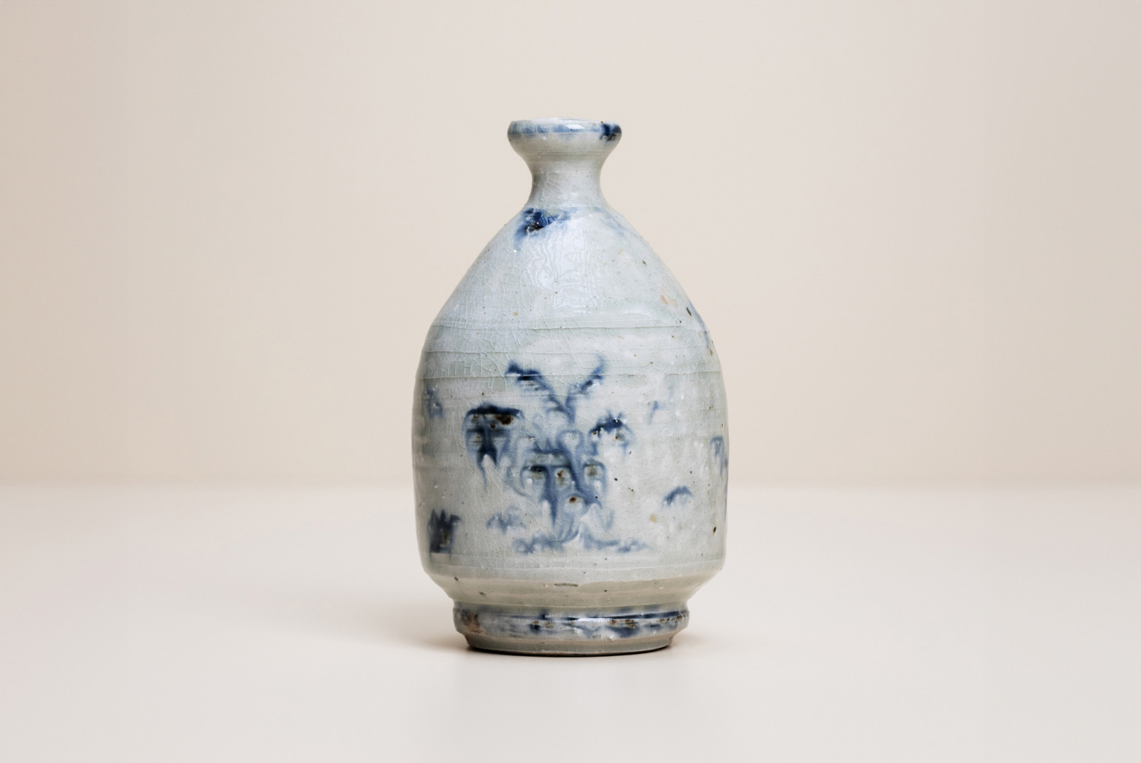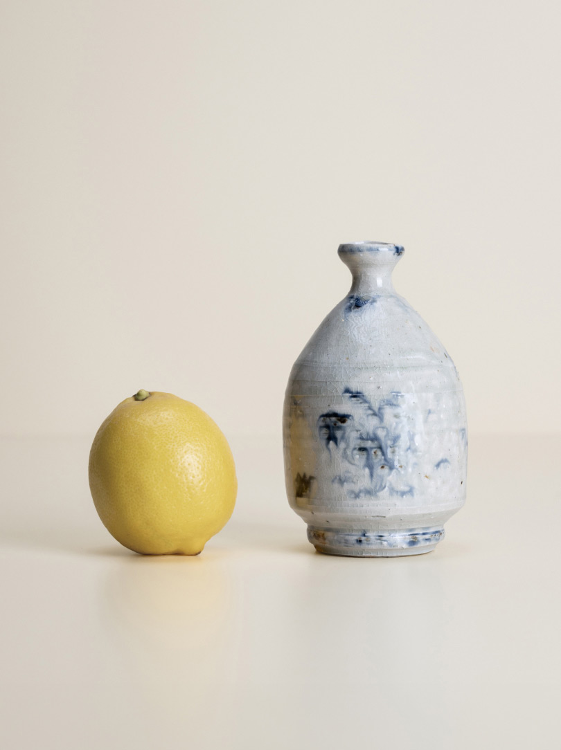 In Japan, ceramic ‘Tokkuri’ pitchers are often used for serving sake. The bulbous shape is for placing in hot water to gently warm the sake inside, then poured out through its narrow neck. What is different about Shingo Oka’s ‘Tokkuri’ is that it has a hand-thrown appeal and is finished with blue drawings, reminiscent of those on Vietnamese ceramics, which have a smudged effect – almost as if they were unintentional.