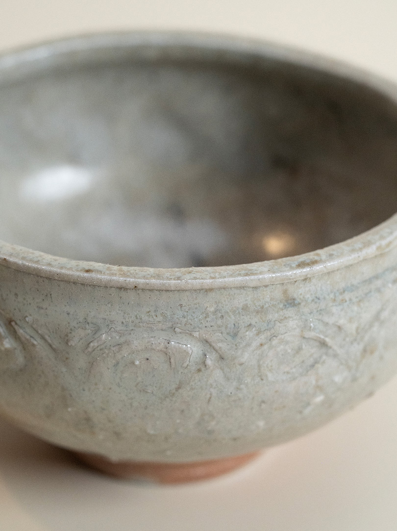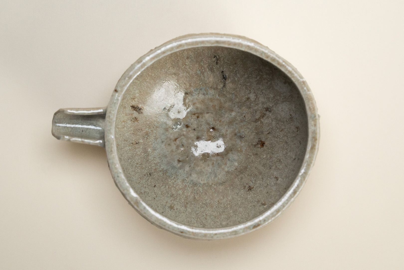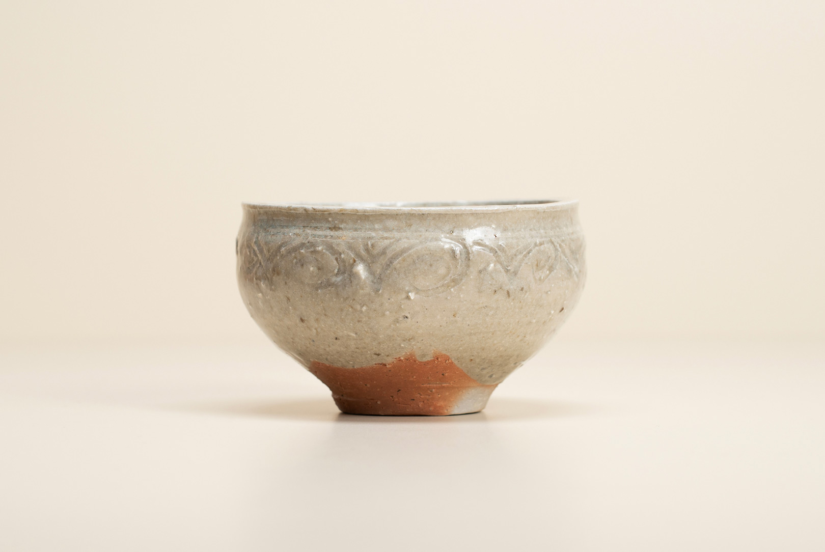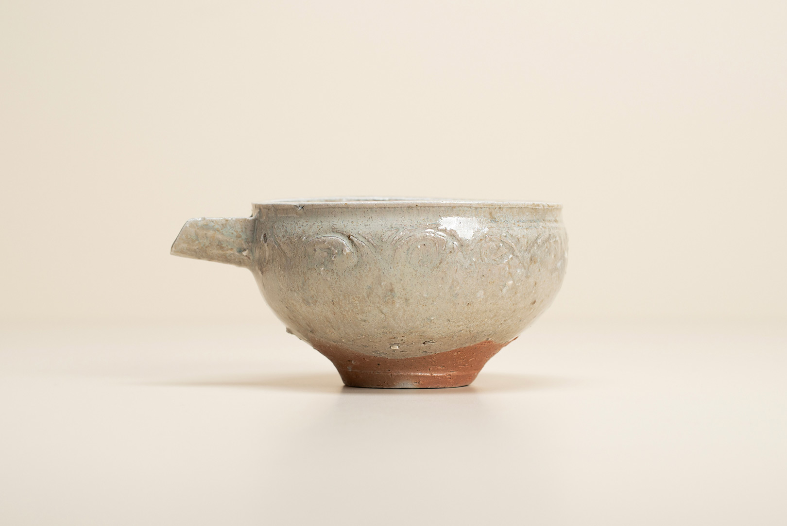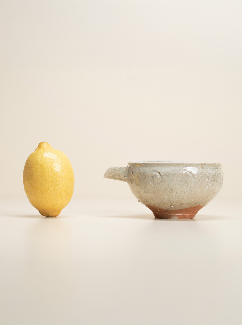 The ‘Katakuchi’ sake pitcher is ideal for sake or other liquids and can also serve as a vessel for tea or flowers. Shingo Oka uses the ‘Mishima Karatsu’ technique, in which carved patterns are inlaid with layers of white slip. Originating in Korea, this method creates a soft white surface beneath a clear glaze. After firing, patterns emerge subtly, balancing rustic warmth with refined elegance.