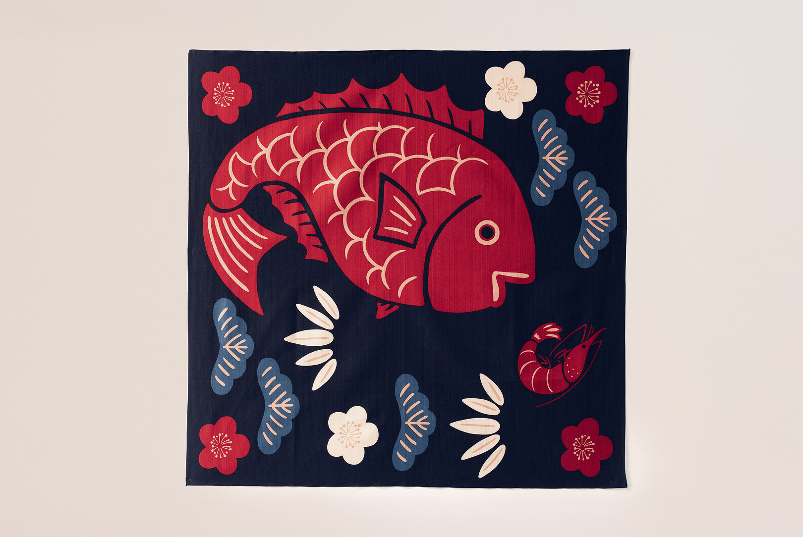 Hand-crafted by the fourth-generation family-run Bamba Dyeing Factory in Kyoto, this Auspicious furoshiki has been made using a traditional – and now rare – Japanese method of manual stencil dyeing. The joyful motifs carry deep meaning, with the red seabream warding off evil spirits, the curved shrimp symbolising long life, and the ‘shochiku’ plums representing resilience and hope.