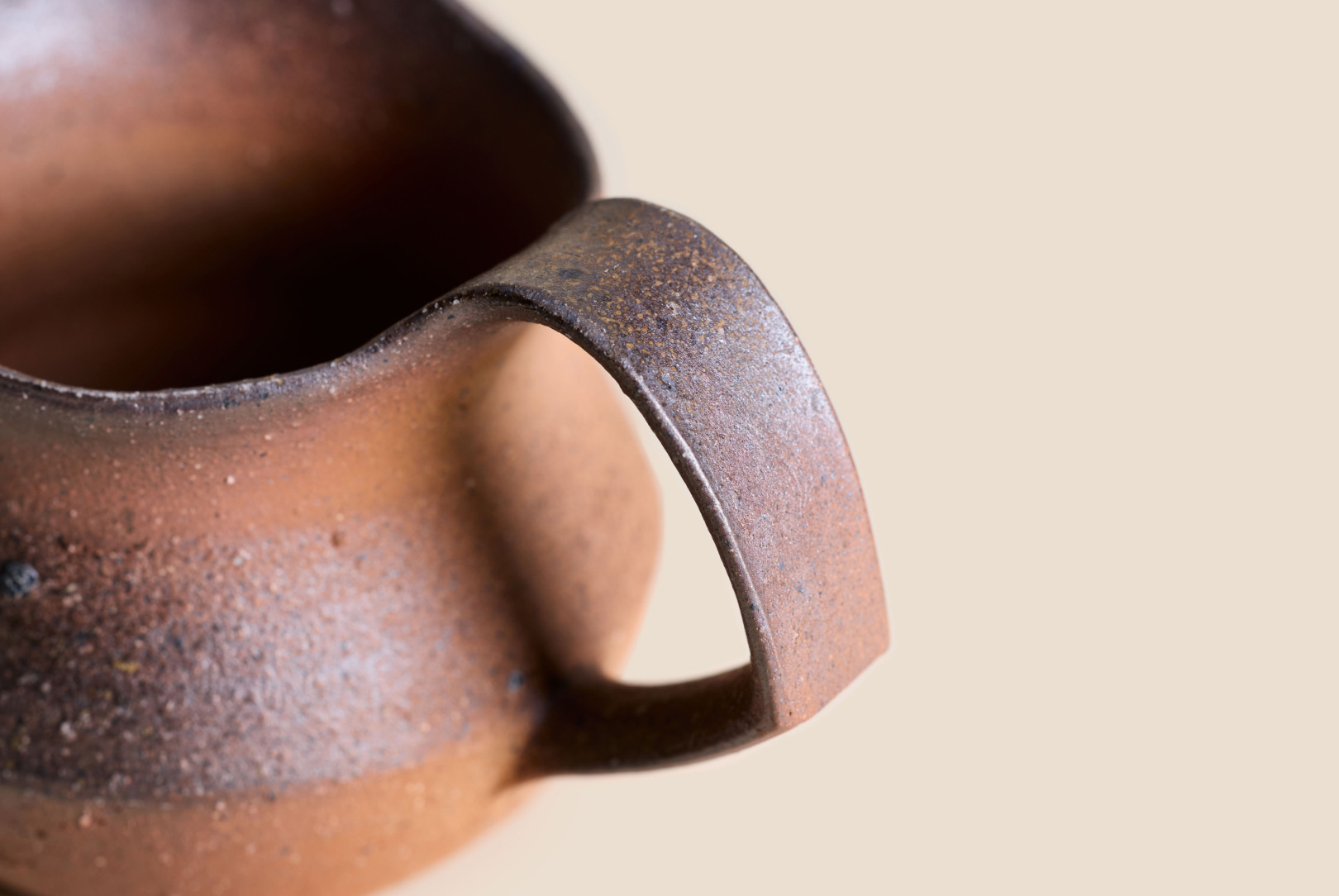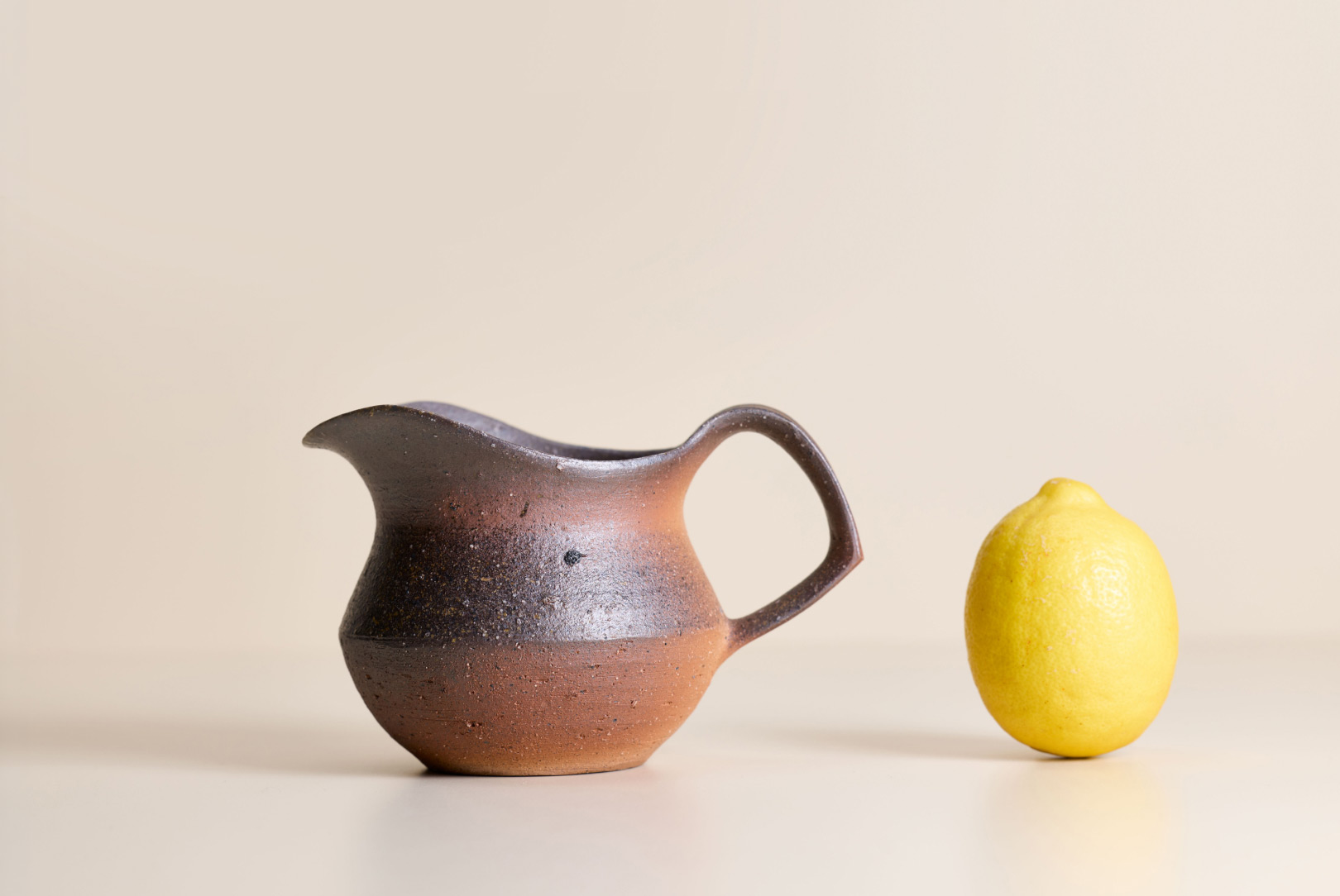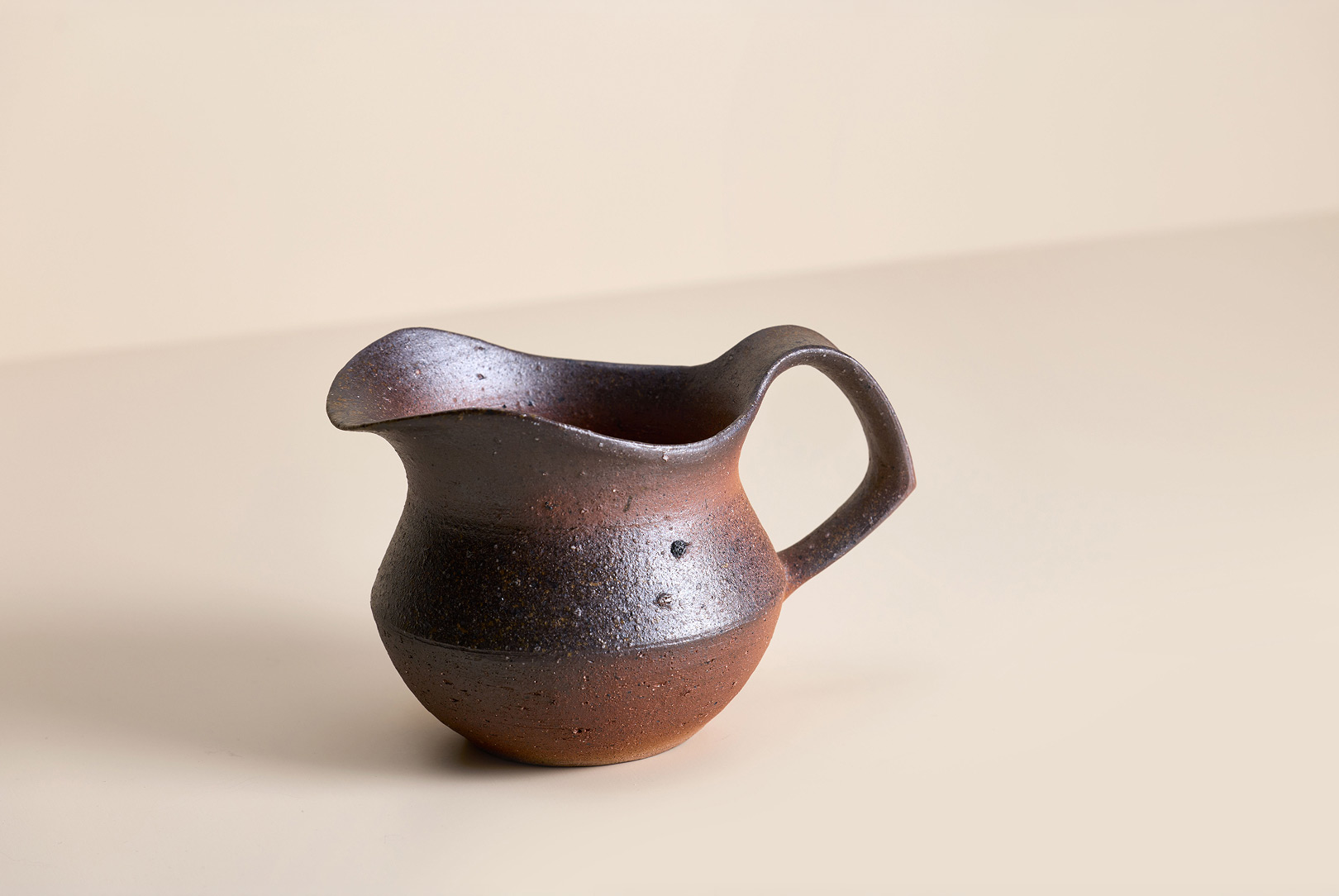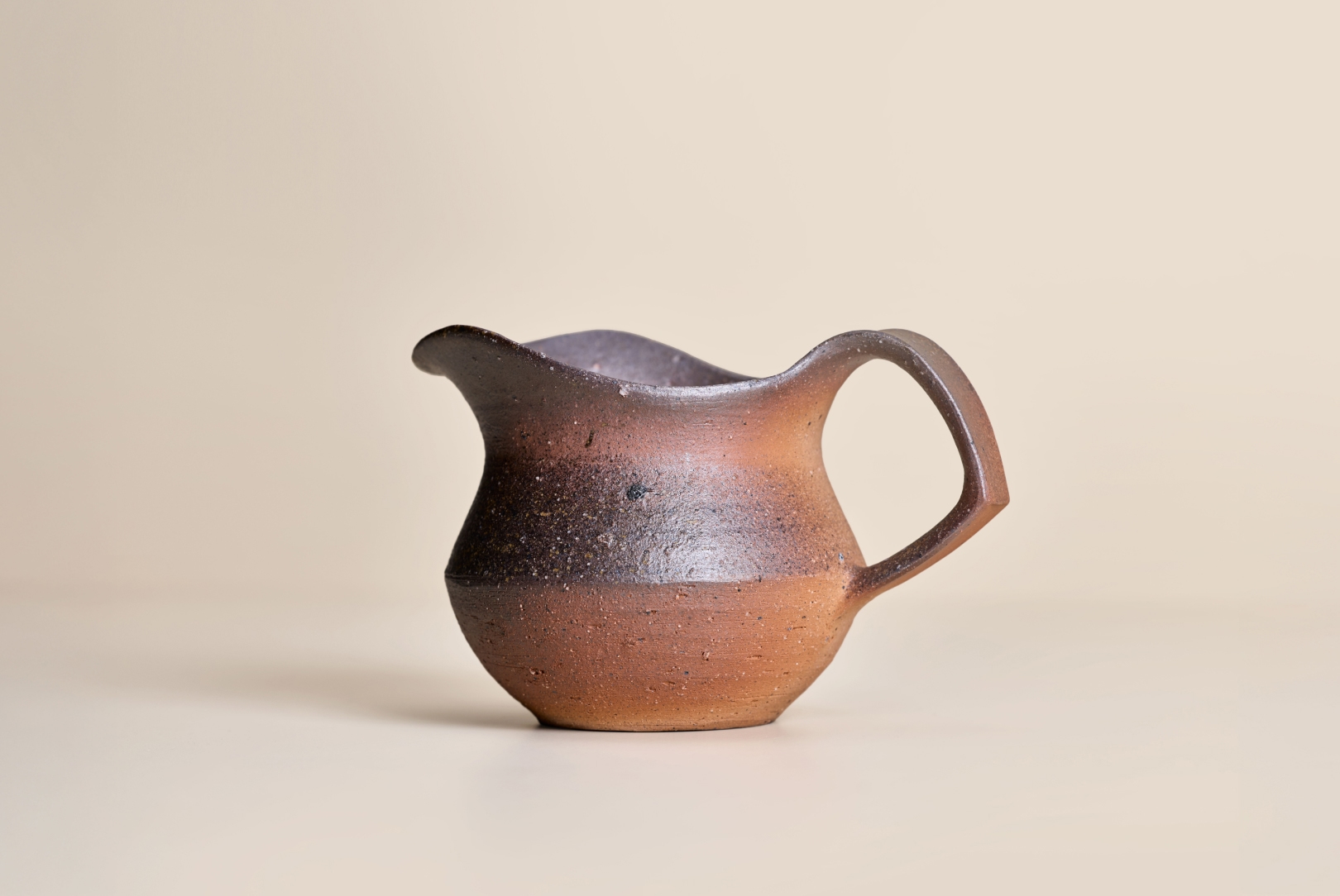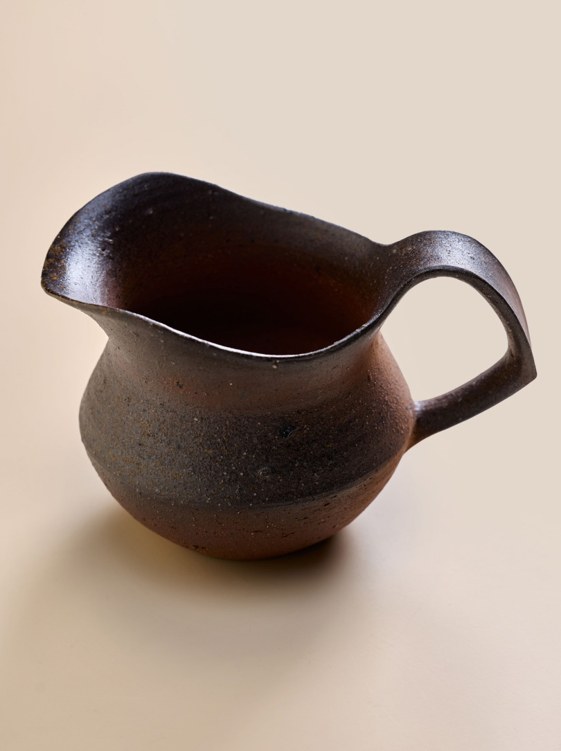 This smaller Bizen pitcher by Japanese ceramic artist Hitoshi Morimoto features a wider, more grounded profile, giving it a calm, settled presence. The high firing leaves a natural, unglazed finish, marked by soft tonal changes and a surface that feels increasingly responsive in the hand.