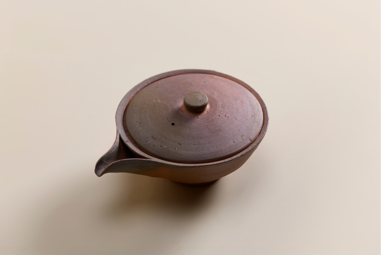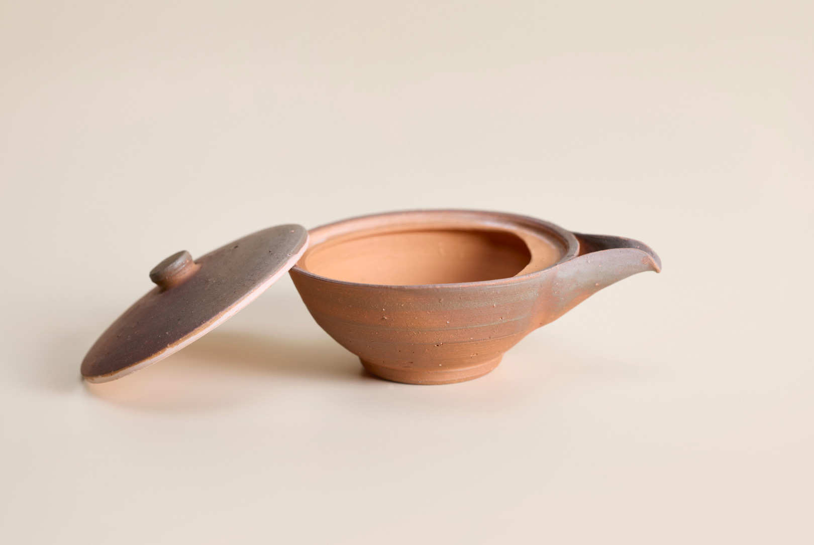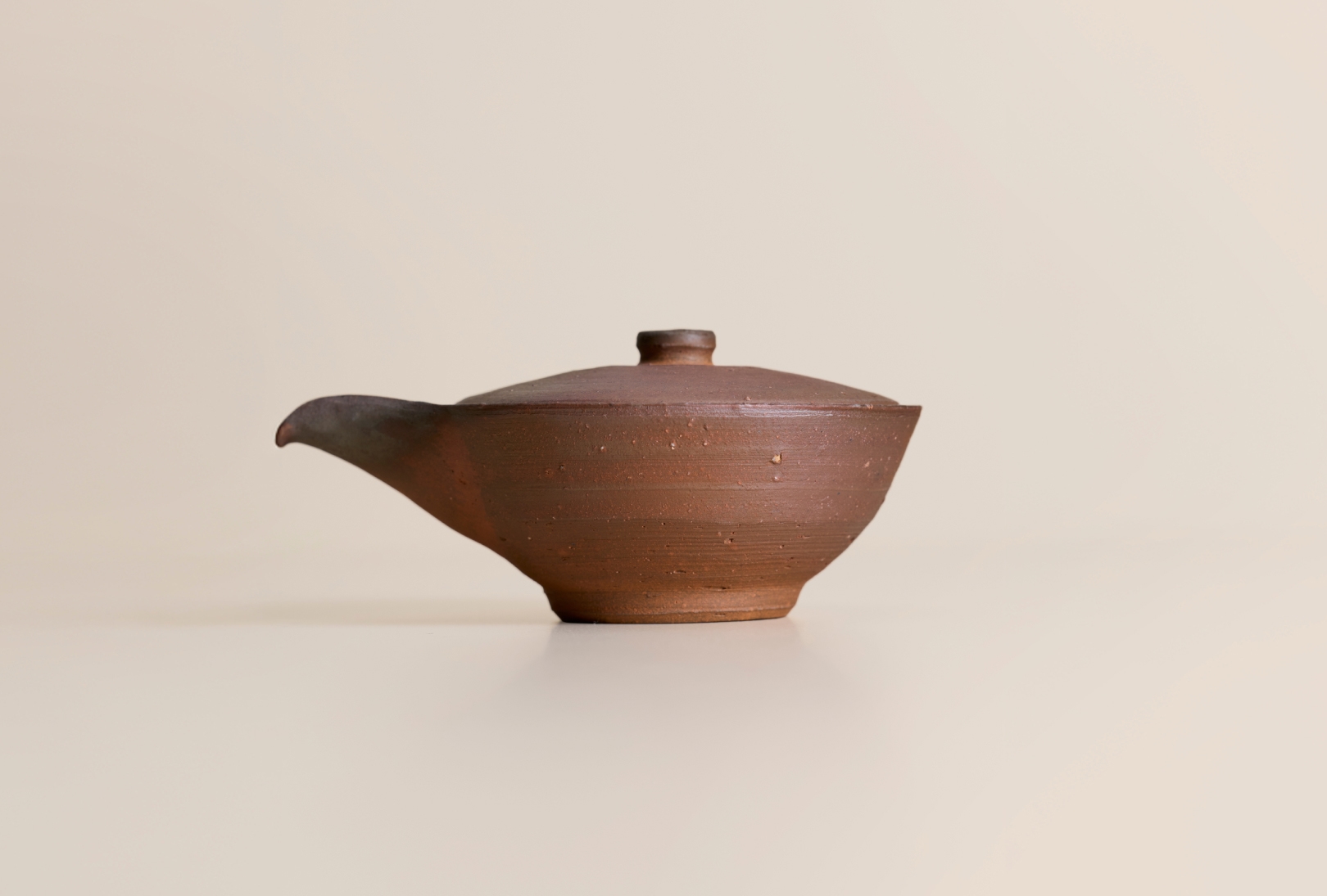 This Bizen hohin teapot is shaped for gyokuro, whose low-temperature brewing benefits from a wide, shallow vessel. Its flattened form allows the leaves to open gently, while the unglazed surface bears soft tonal shifts from flame and ash, giving the piece, by Bizen ceramic artist Hitoshi Morimoto, a quiet, purposeful presence.