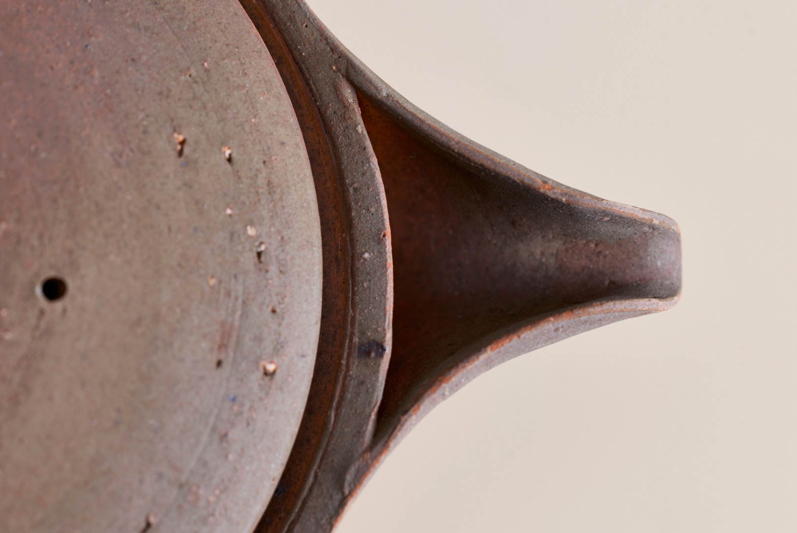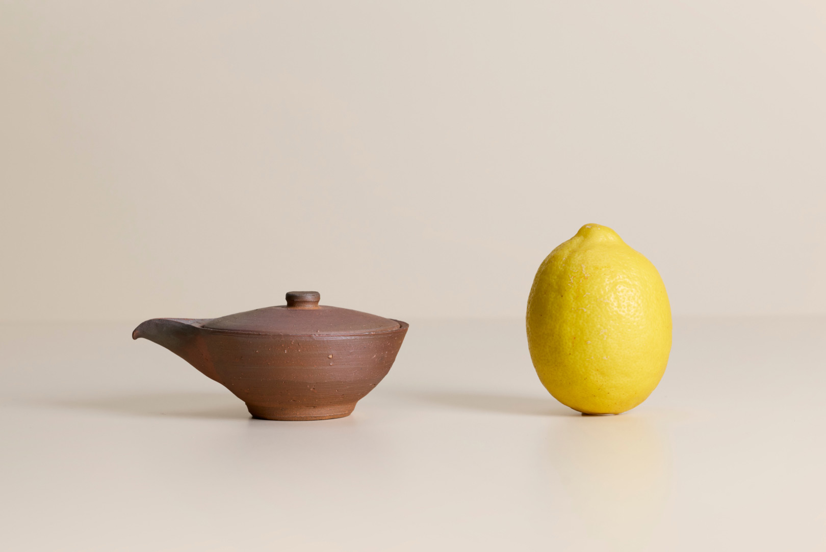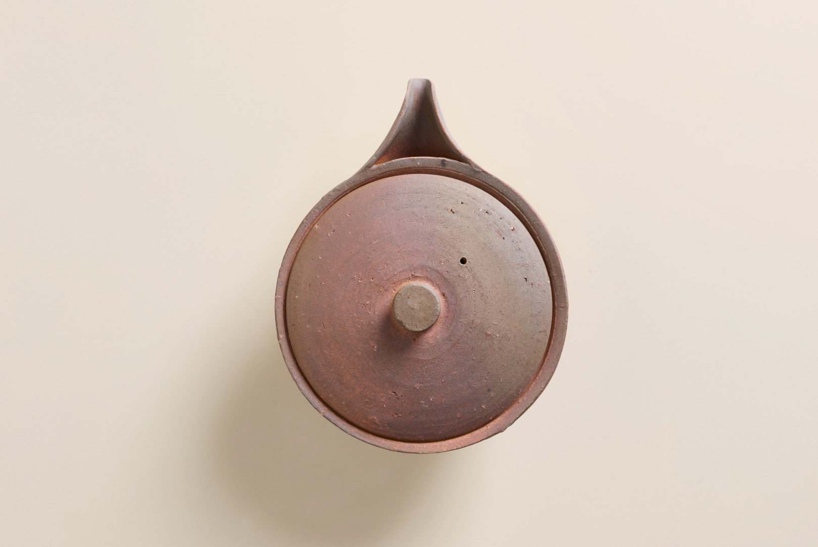 This Bizen hohin teapot is shaped for gyokuro, whose low-temperature brewing benefits from a wide, shallow vessel. Its flattened form allows the leaves to open gently, while the unglazed surface bears soft tonal shifts from flame and ash, giving the piece, by Bizen ceramic artist Hitoshi Morimoto, a quiet, purposeful presence.