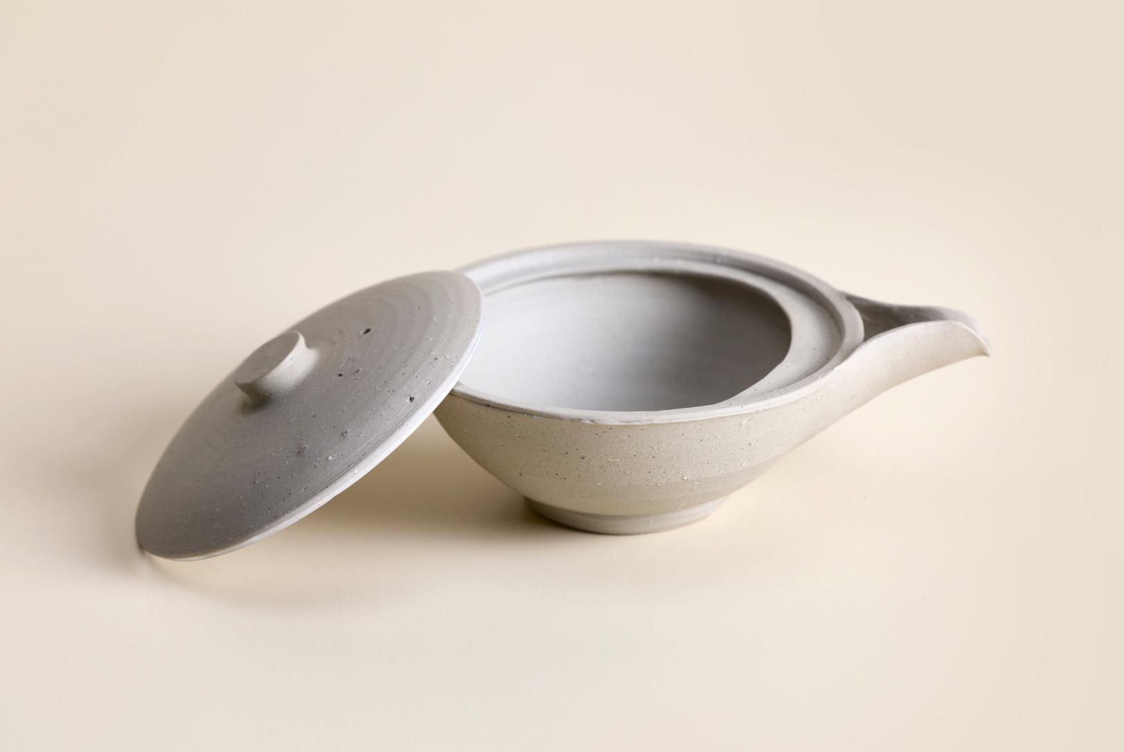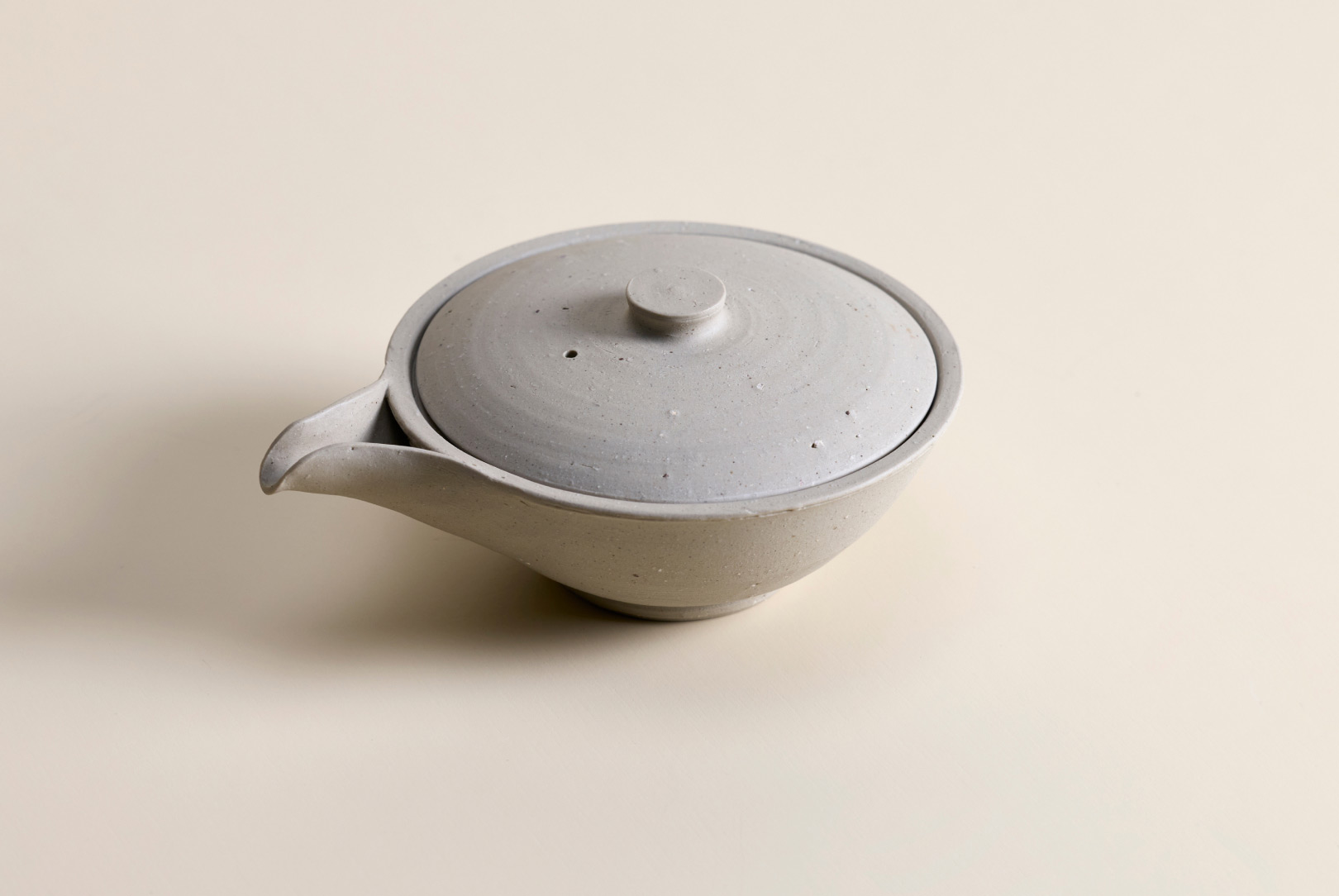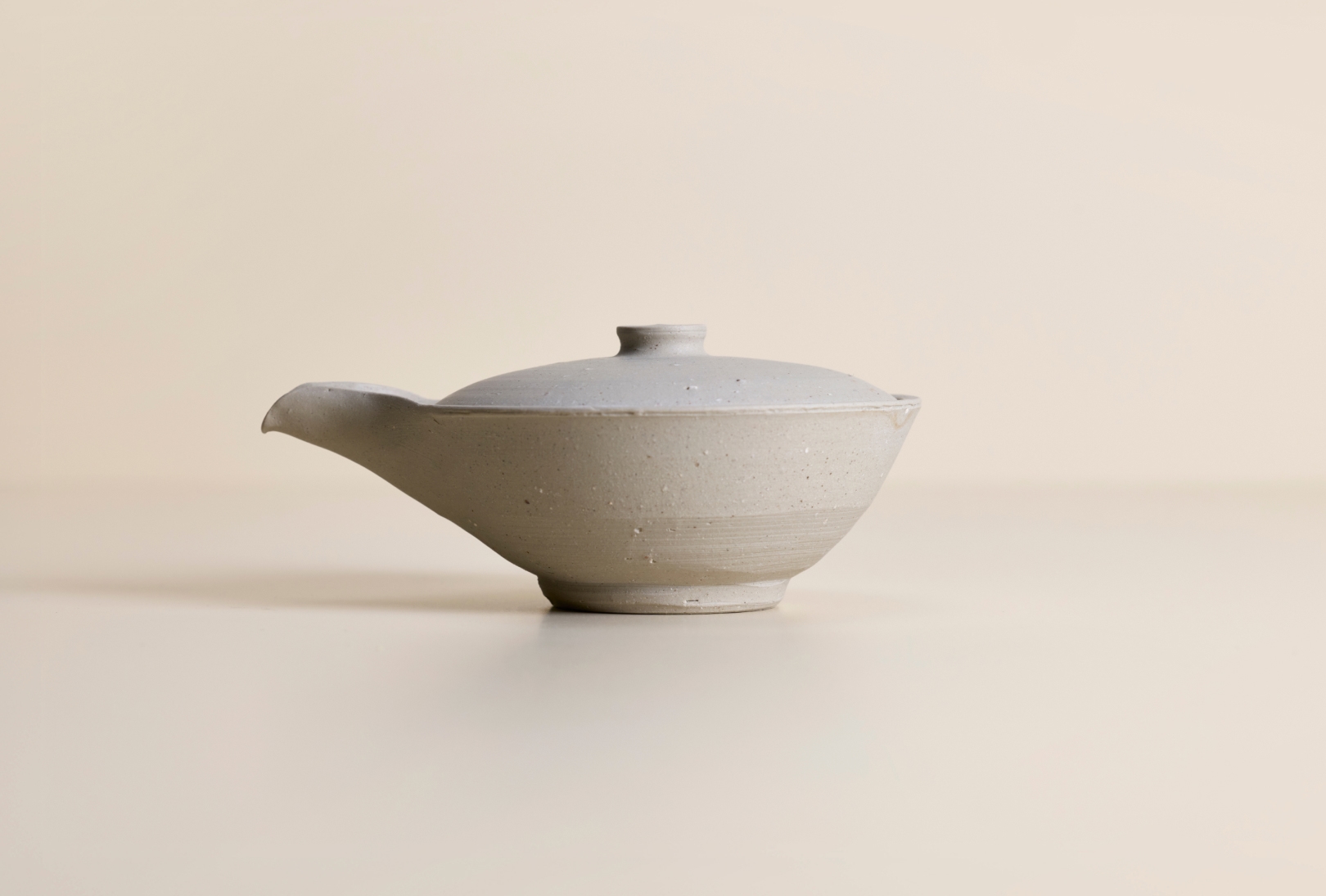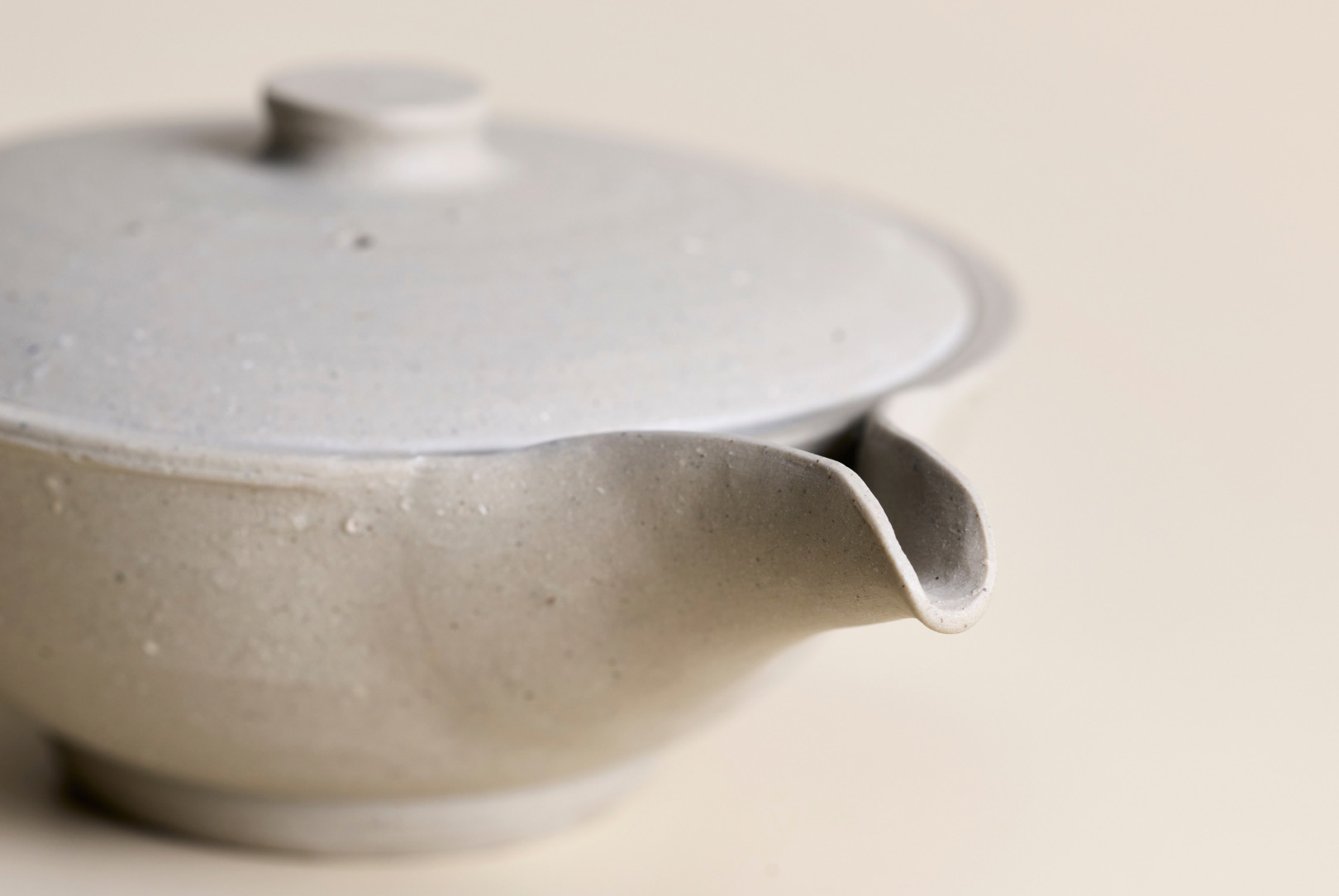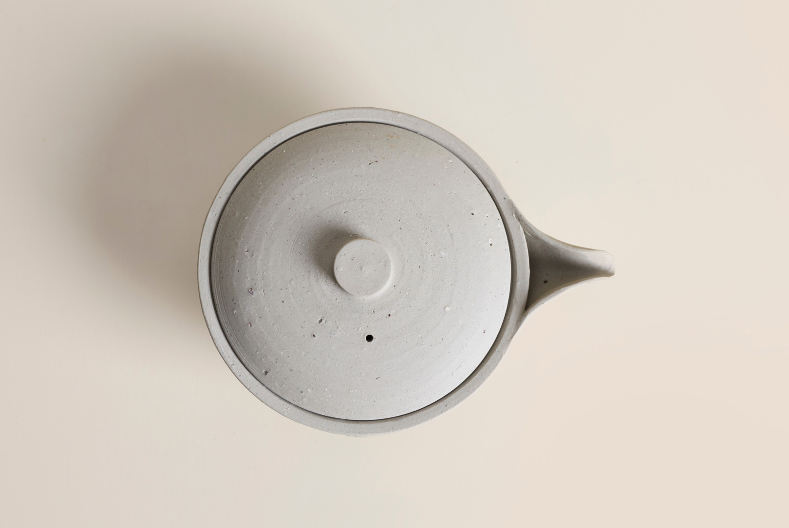 This Shirahana hohin teapot is shaped for low-temperature brewing, with a flat, open form that allows gyokuro leaves to unfurl gently. Fired from Bizen clay to a soft white finish, its matt surface and restrained silhouette give the piece a calm, almost architectural clarity.
