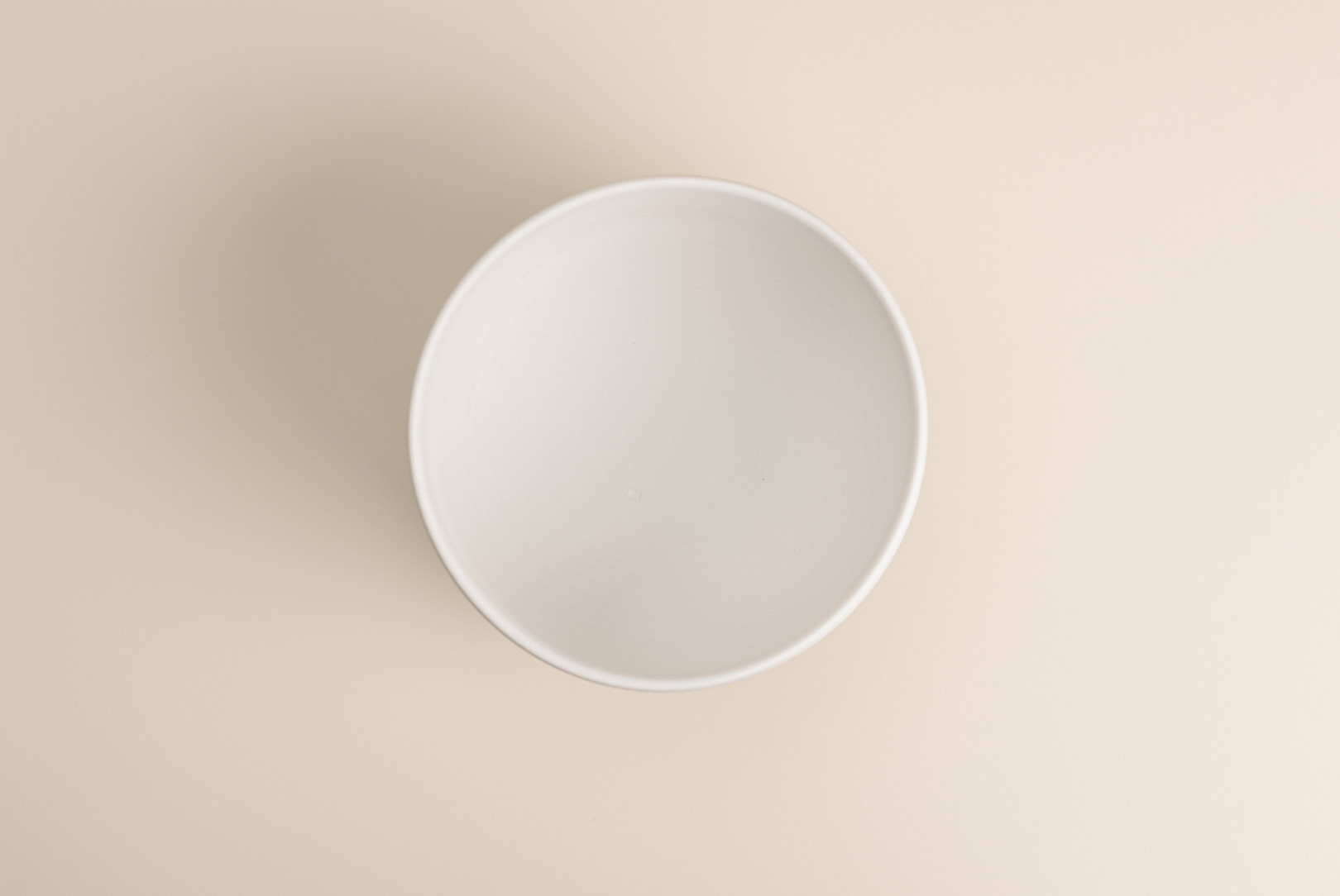 Part of a group of 3 white bowls – small, medium and large. Crafted individually, each piece embodies a unique form and identity, shaped by the artist’s intellectual and physical interaction during its creation. With its minimalist architectural character, this vessel has a presence that gracefully fills the space. Though not immediately visible, the tiny pedestal elevates the bowl, creating an ever-changing interplay of light and shadow around and below it. Despite its delicate appearance, the surface is pleasantly rough to the touch; as your hands glide over the vessel’s curves, a raw sound emerges, reminiscent of nature and unexpectedly soothing. A multi-sensory piece, with the perfect aesthetic dimensions, it promises daily delight, regardless of its intended use.