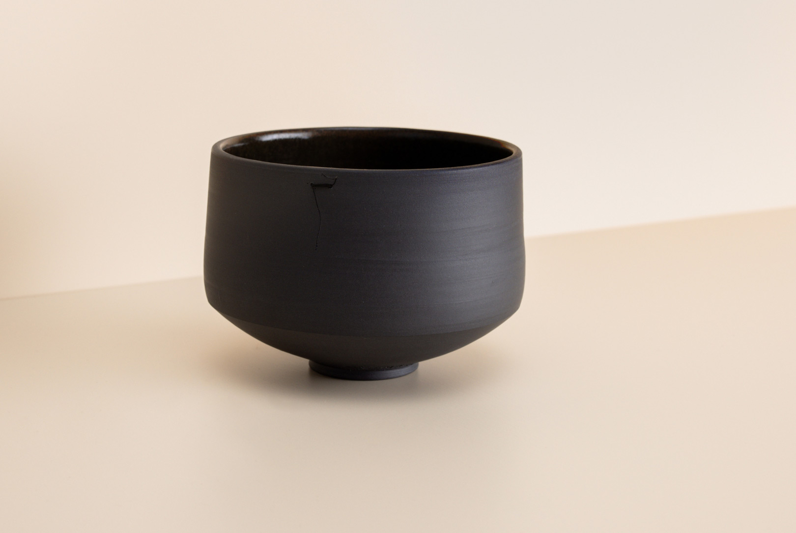 Crafted individually, each piece embodies a unique form and identity, shaped by the artist’s intellectual and physical interaction during its creation. With its minimalist architectural character, this vessel has a presence that gracefully fills the space. Though not immediately visible, the tiny pedestal elevates the bowl, creating an ever-changing interplay of light and shadow around and below it. Despite its delicate appearance, the outer surface is pleasantly rough to the touch; as your hands glide over the vessel’s curves, a raw sound emerges, reminiscent of nature and unexpectedly soothing. The interior of the vessel is glazed, creating an interplay of light and reflections. This multi-sensory piece promises daily delight, regardless of its intended use.
