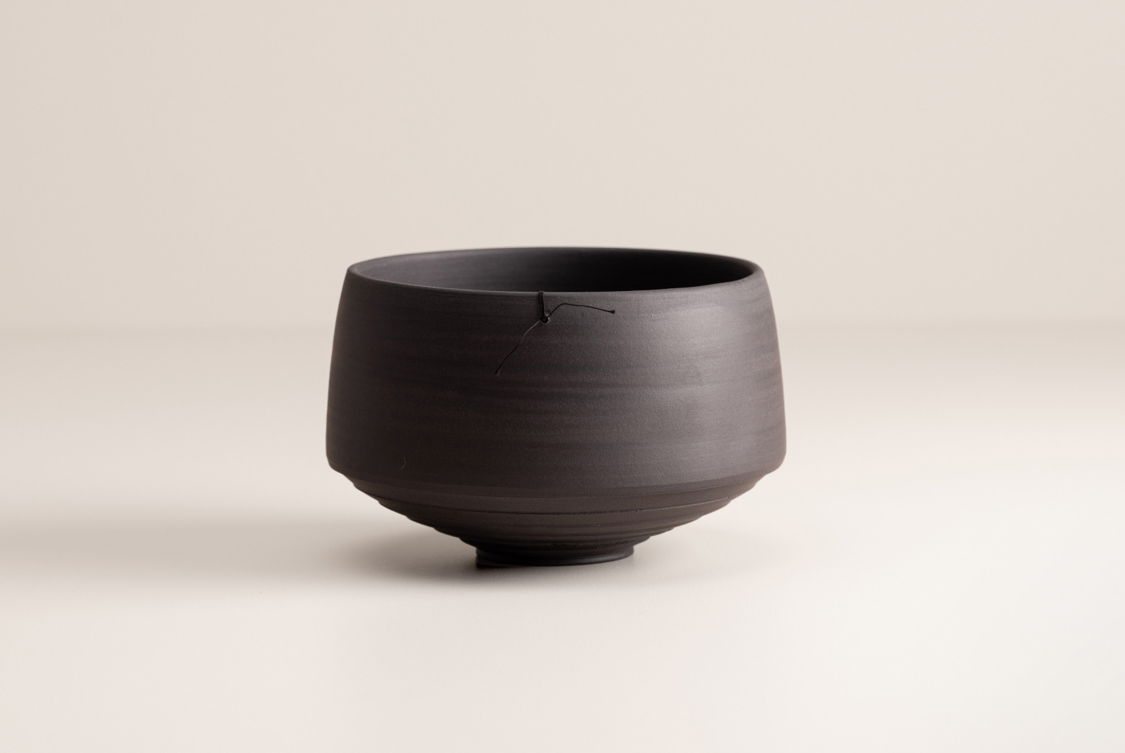 Crafted individually, each piece embodies a unique form and identity, shaped by the artist’s intellectual and physical interaction during its creation. With its minimalist architectural character, this vessel has a presence that gracefully fills the space. Though not immediately visible, the tiny pedestal elevates the bowl, creating an ever-changing interplay of light and shadow around and below it. Despite its delicate appearance, the surface is pleasantly rough to the touch; as your hands glide over the vessel’s curves, a raw sound emerges, reminiscent of nature and unexpectedly soothing. A multi-sensory piece that promises daily delight, regardless of its intended use.