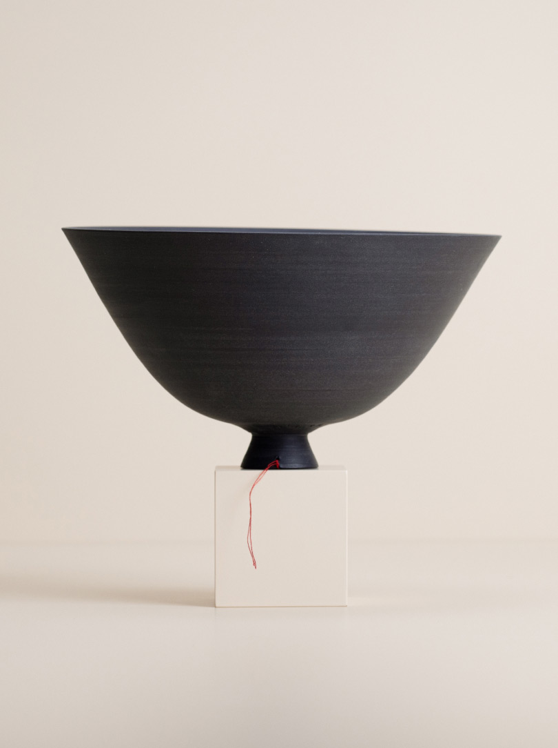 This piece features an accompanying red thread, a recurring motif in Helga Ritsch’s work. This unexpected object of daily use seamlessly integrates with the vessel and adds more character to it. Over time, this delicate decorative element might detach itself from the vessel – a “loss” that isn’t truly a loss, as it symbolises your ongoing appreciation and use of the piece.