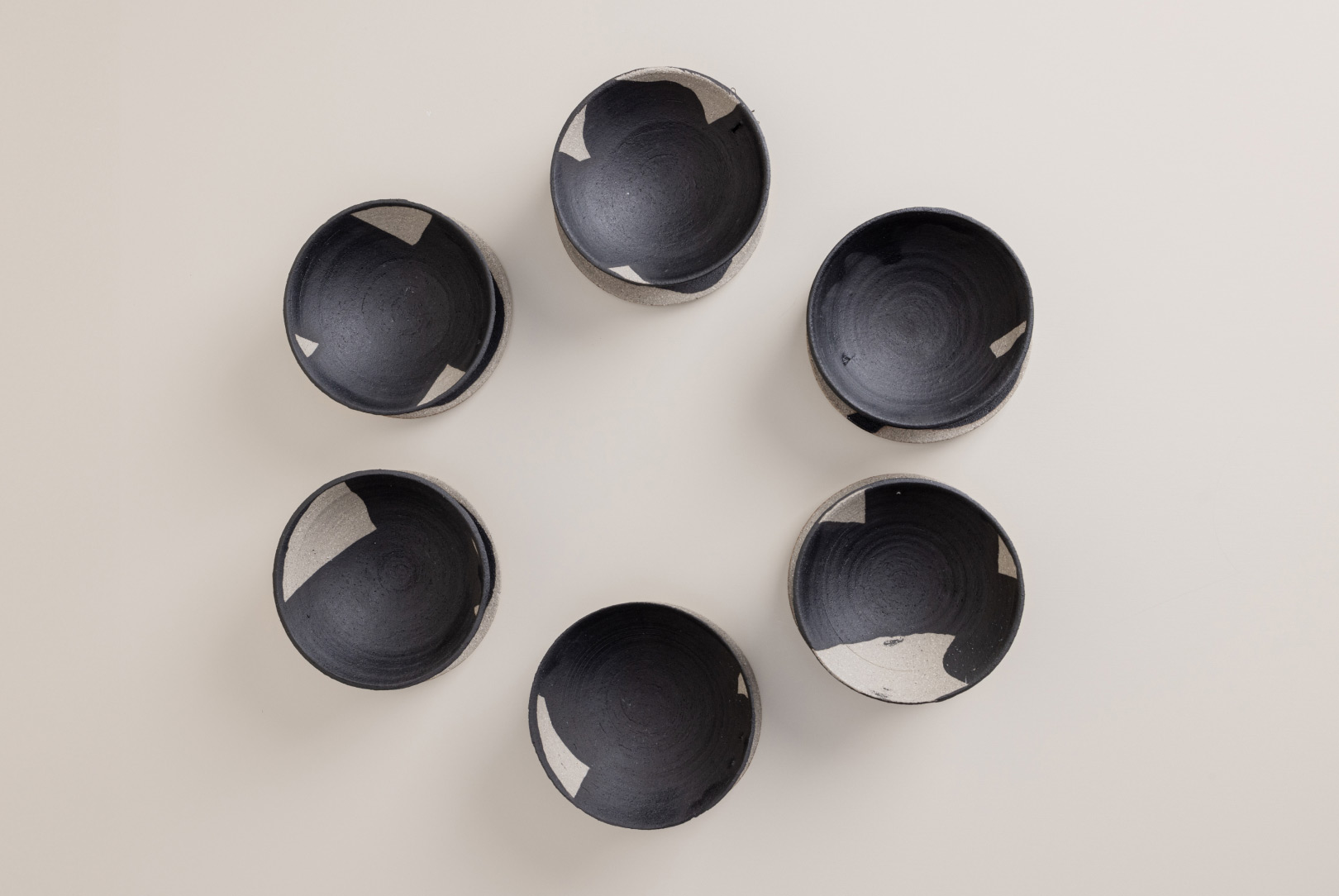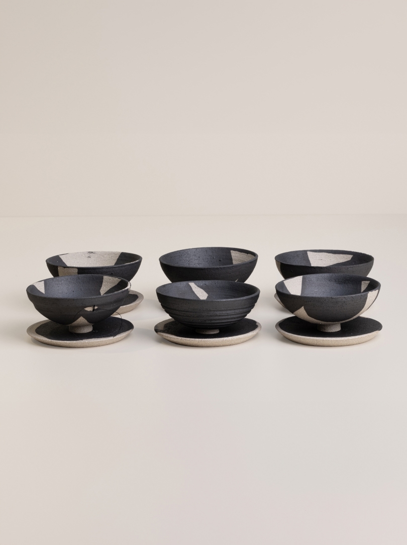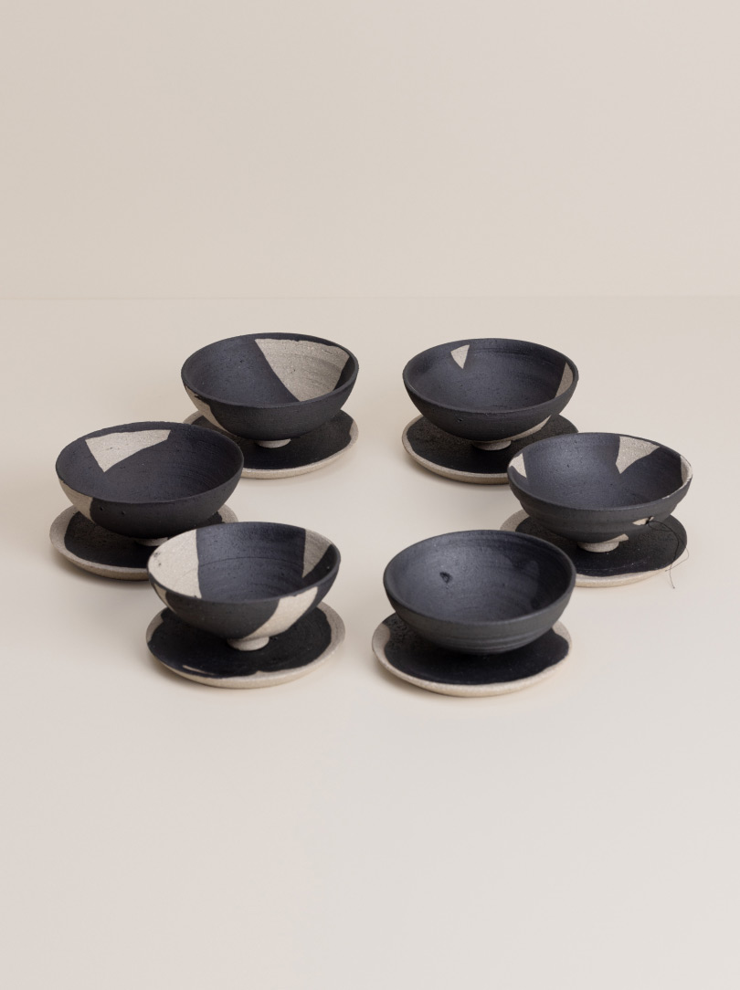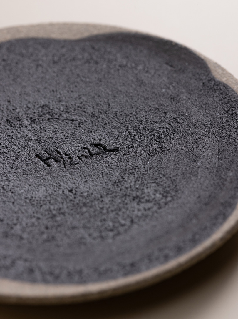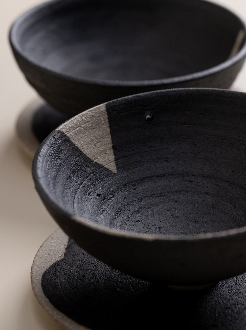 This classic pairing, a drinking bowl and its accompanying saucer, acquires a poetic allure. The textured stoneware beautifully complements the duo’s delicate appearance. Individually crafted, each creation is adorned with black engobe, creating an additional interplay between materials, colours and forms. Crafted individually, each piece embodies a unique form and identity, shaped by the artist‘s intellectual and physical interaction during its creation. Designed to nestle effortlessly in your hands, it promises an experience that balances comfort with aesthetic pleasure.