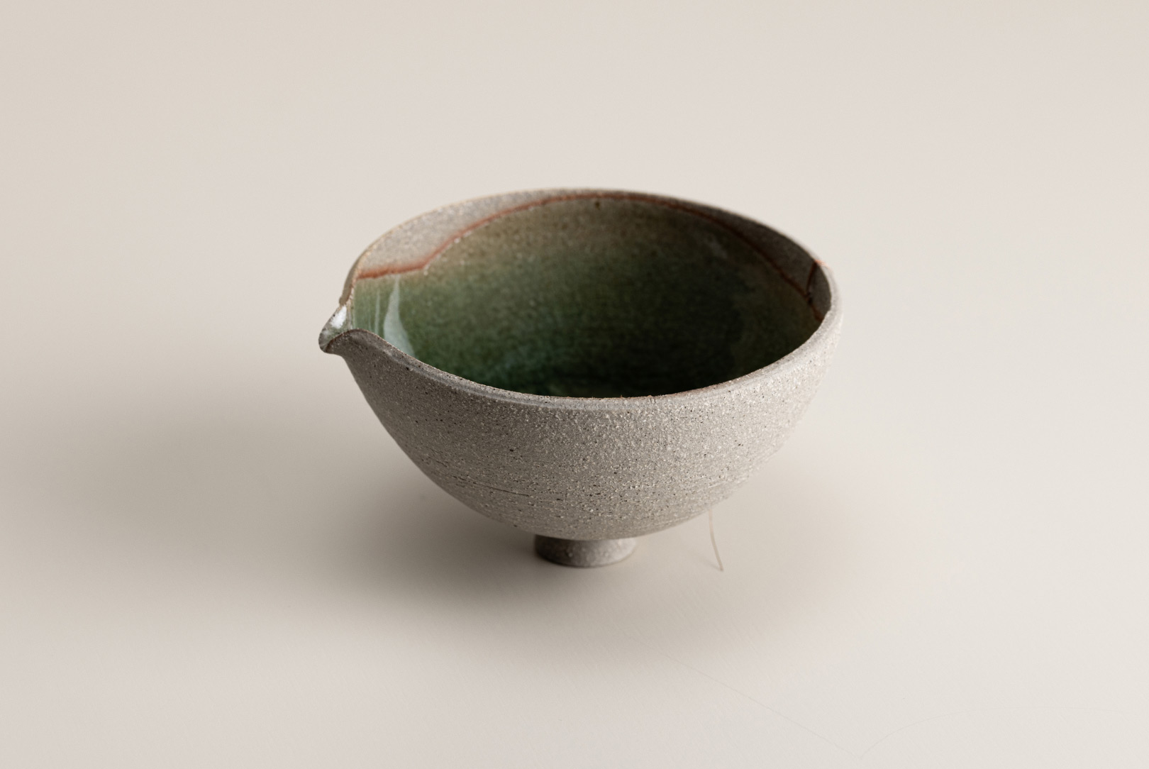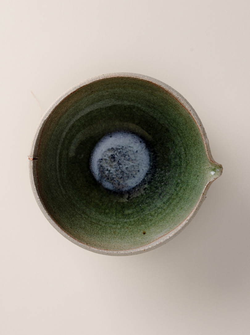 Gradients of shimmering green crackle glaze coat the interior of this otherwise rough-hewn stoneware pouring vessel. The stark contrast between the smooth glaze, with its light-reflecting properties, and the raw matt texture of the curved exterior pleases both hand and eye. When it comes to her craft, Helga Ritsch doesn’t follow any rules or routines, valuing freedom and independence above all else.