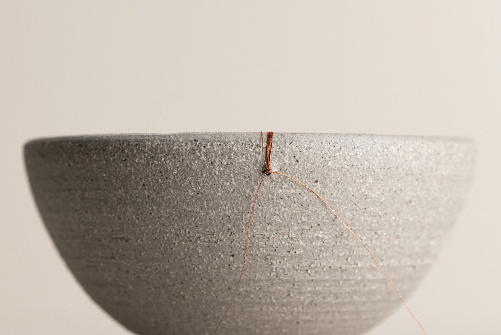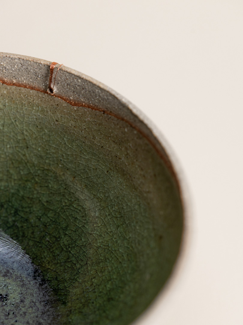 Something that has become a trademark in her work is a copper-toned thread, which also appears here in a different guise – as similarly coloured lines in the shimmering green crackle glaze that developed during the final firing process. The vessel combines form as well as function and can be used or admired daily.
