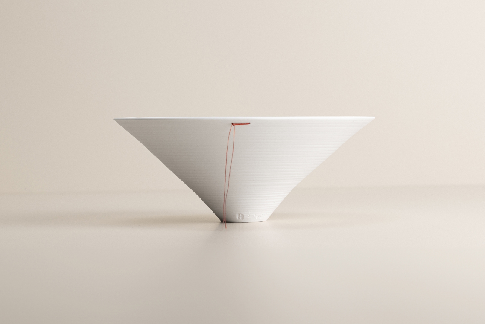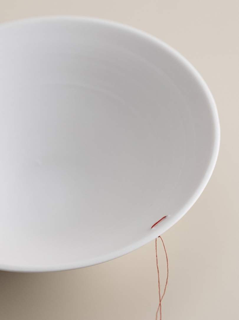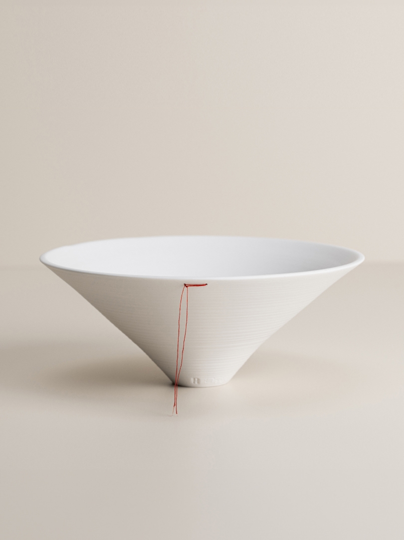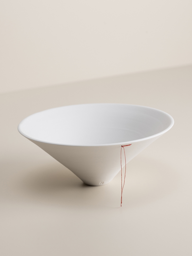 Somewhat resembling an inverted pyramid with a blunt tip, which forms the narrow base, this white translucent porcelain vessel has a majestic presence. The sharply ascending sides, lined with grooves, come together to form a perfect circle; only a tiny red stitch of the artist’s thread punctuates the smooth material near the lip, its end hanging long and loose.