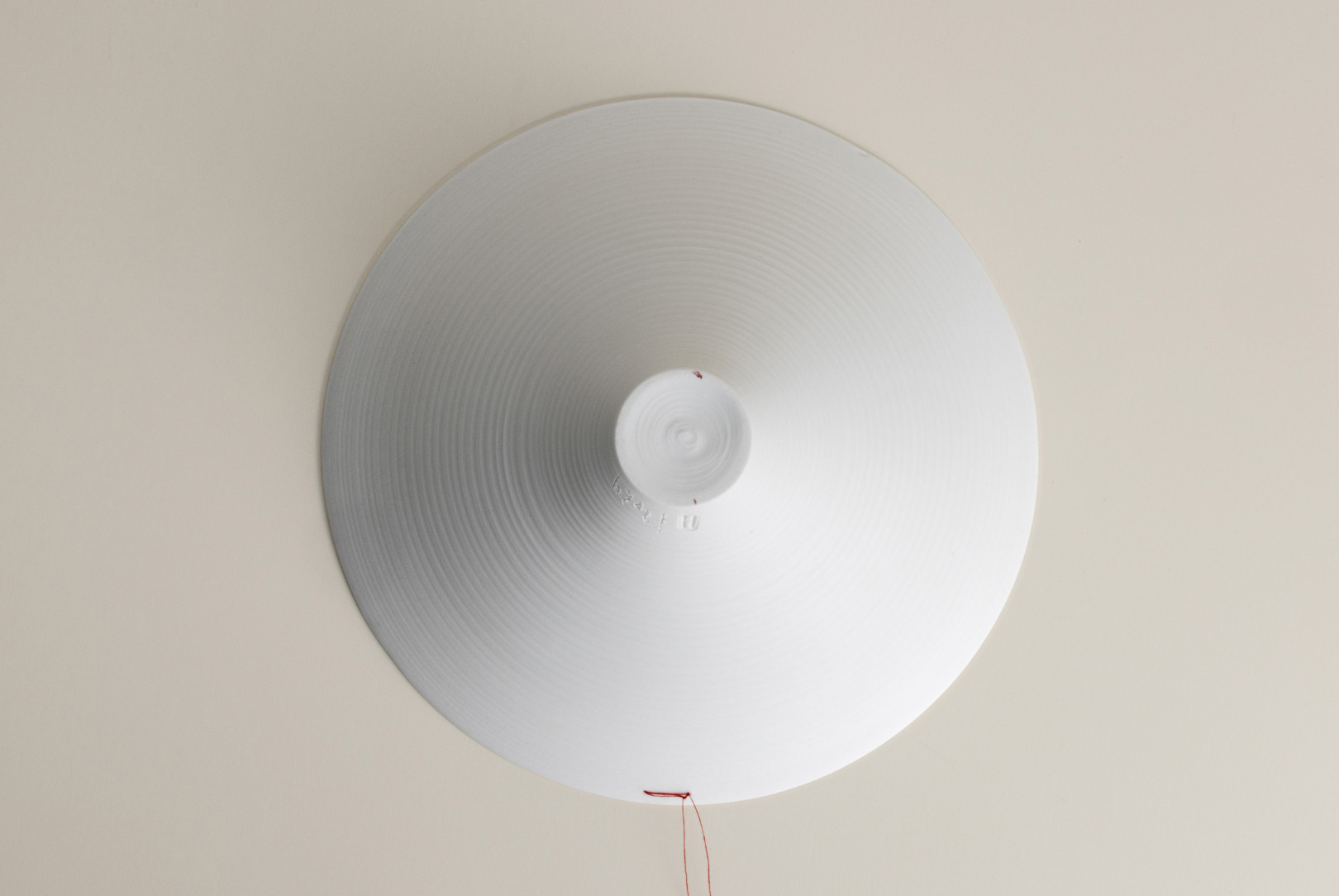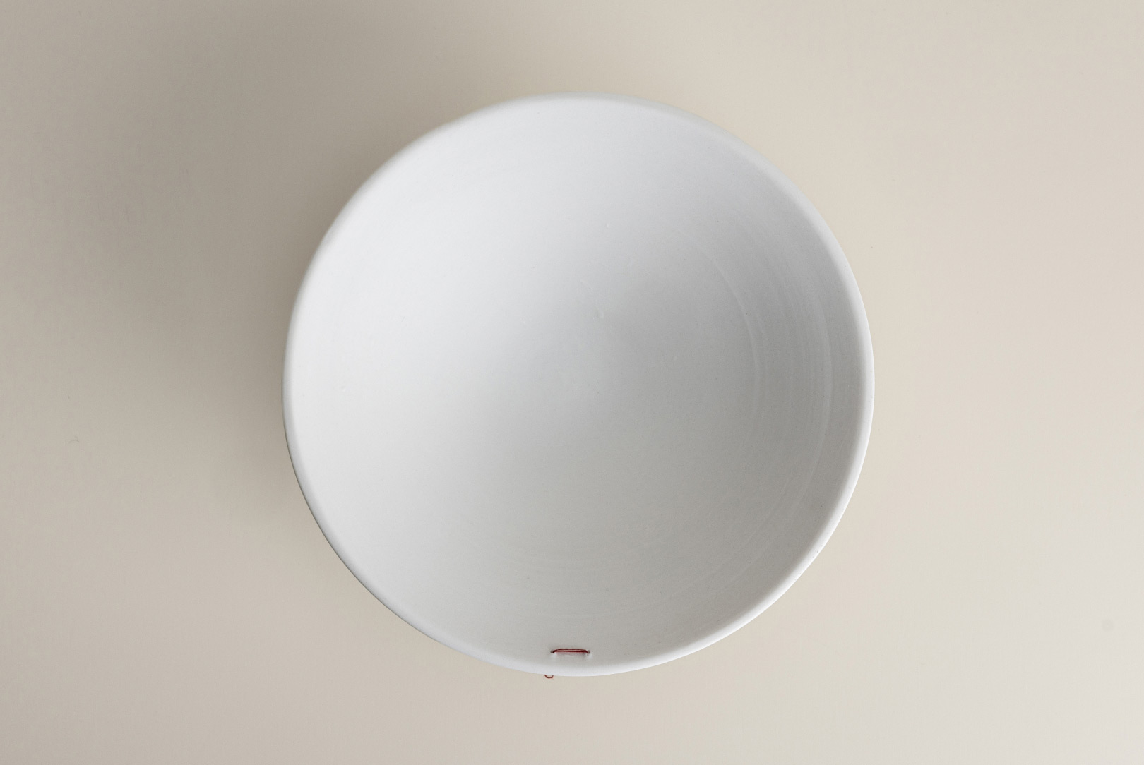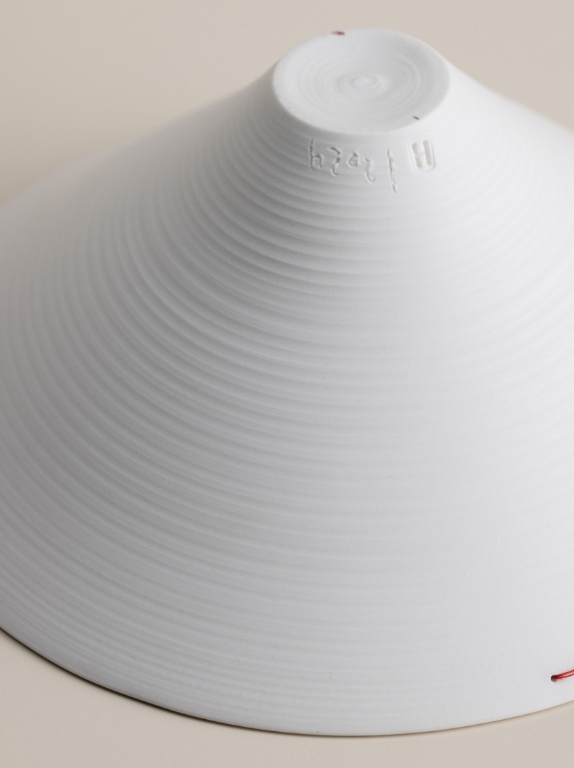 Somewhat resembling an inverted pyramid with a blunt tip, which forms the narrow base, this white translucent porcelain vessel has a majestic presence. The sharply ascending sides, lined with grooves, come together to form a perfect circle; only a tiny red stitch of the artist’s thread punctuates the smooth material near the lip, its end hanging long and loose.