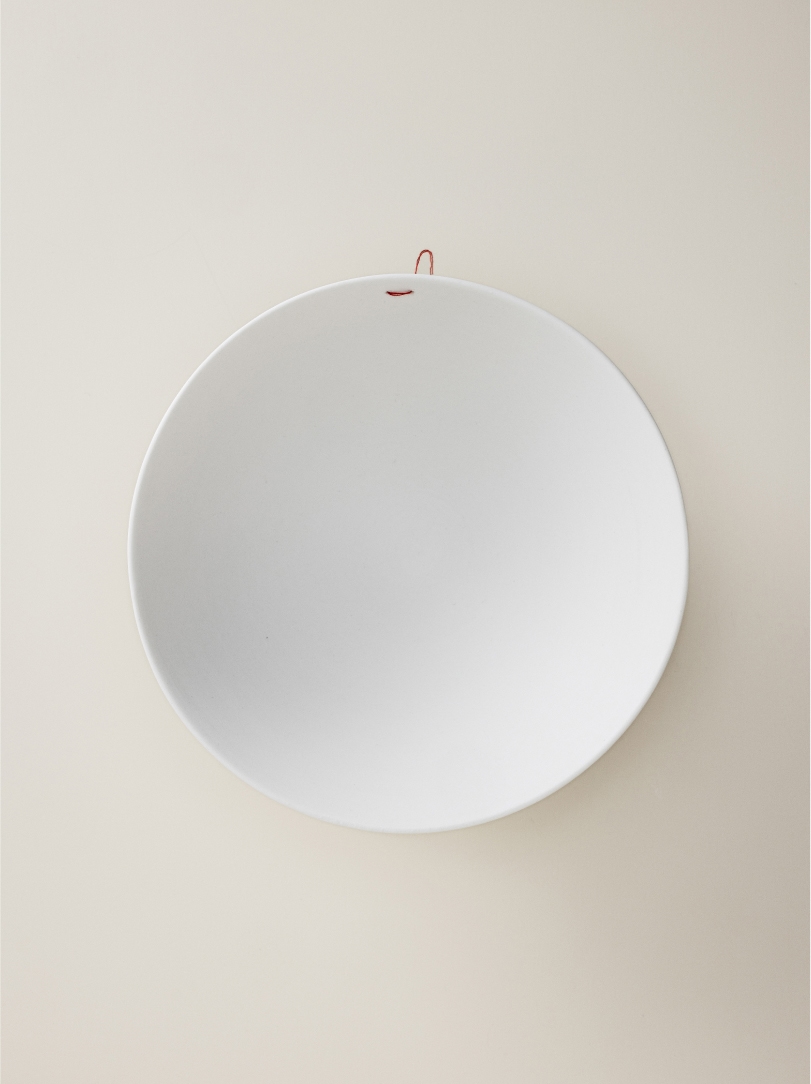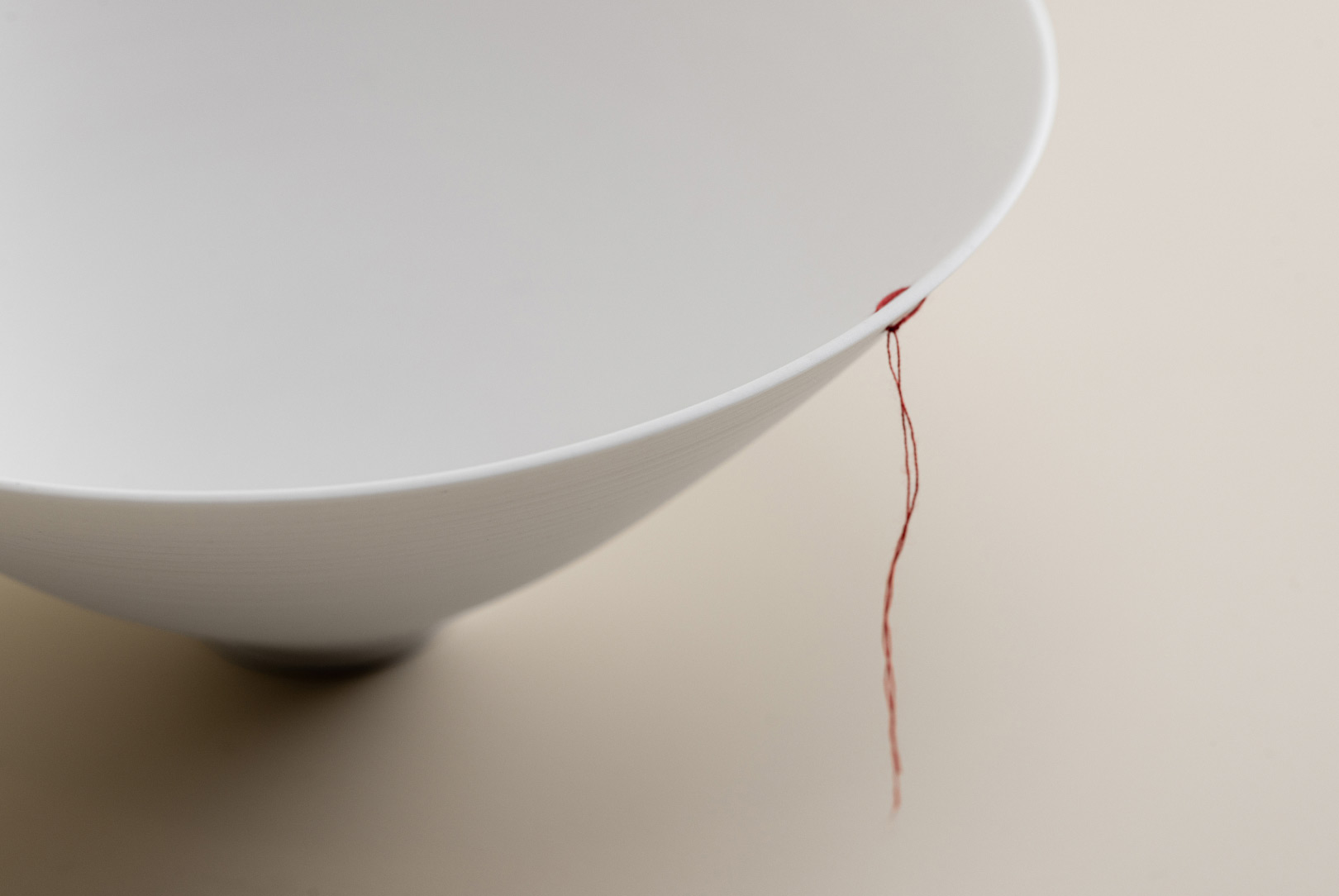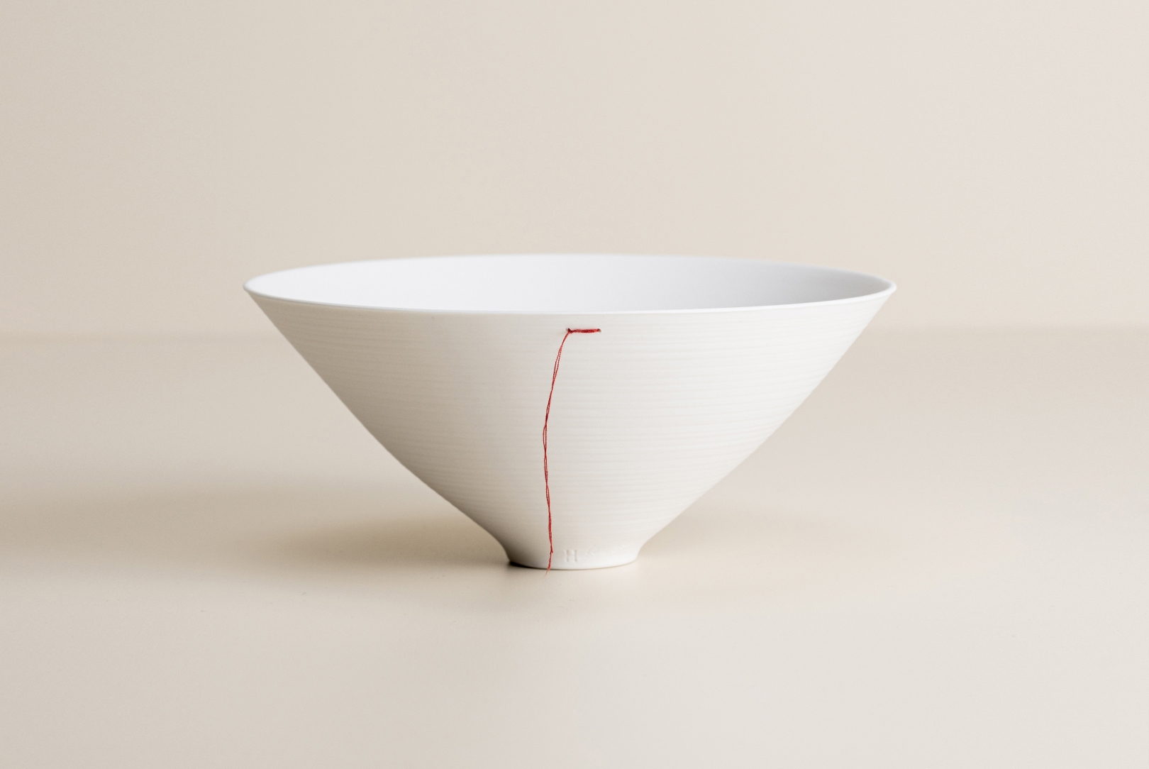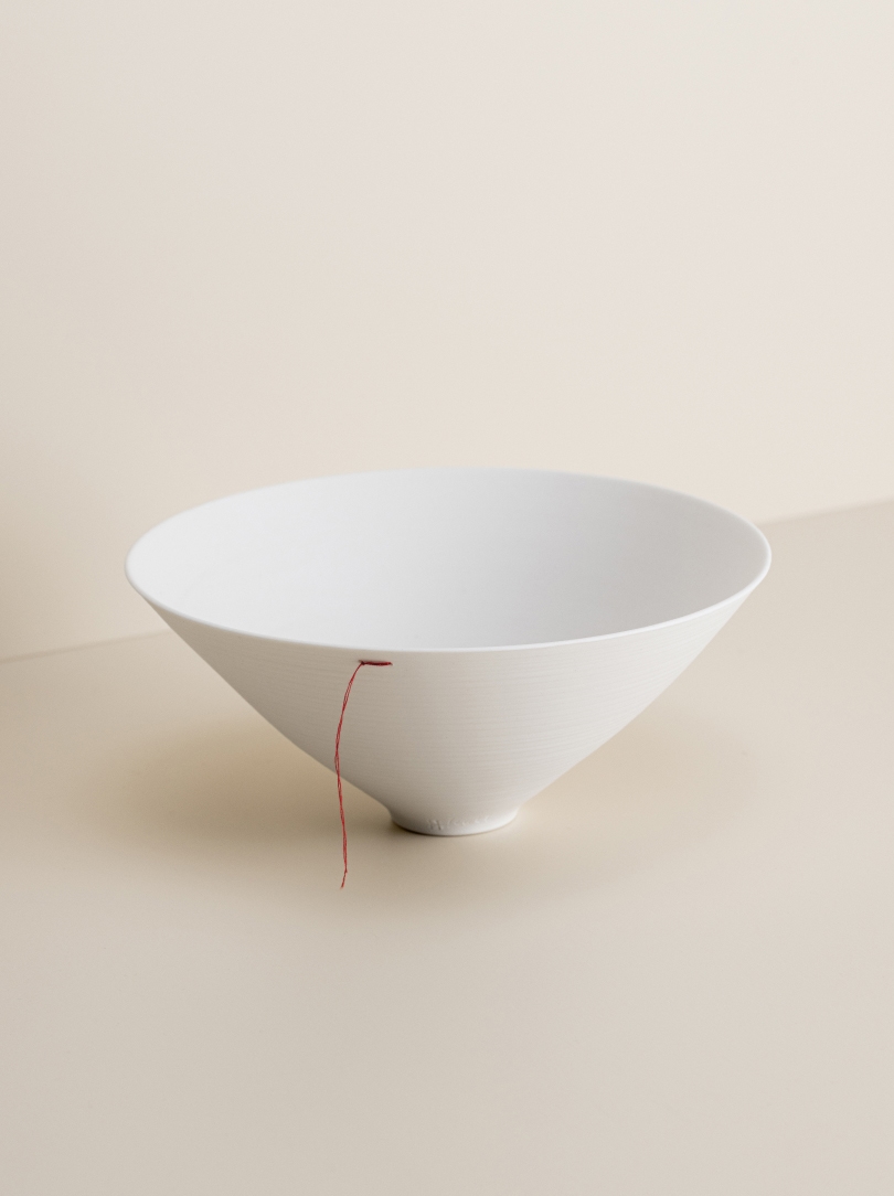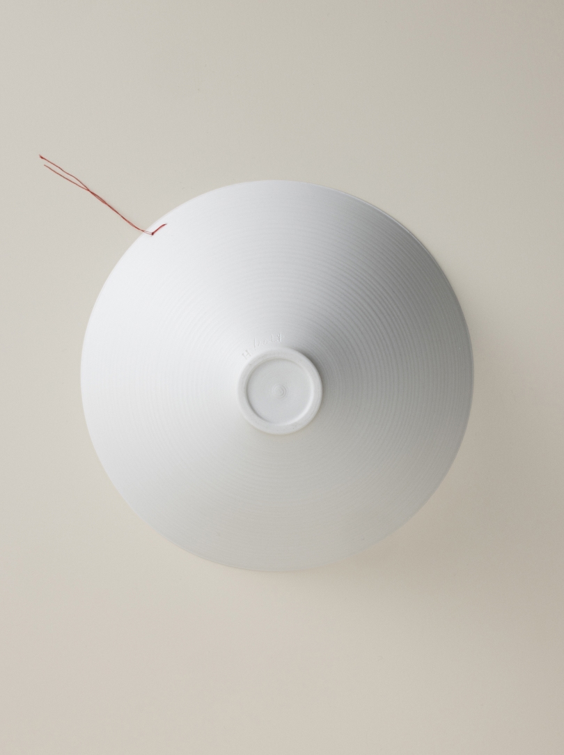 Like so many of the artist’s pieces, a singular red thread is a distinguishable feature – this time looped horizontally just below the rim.