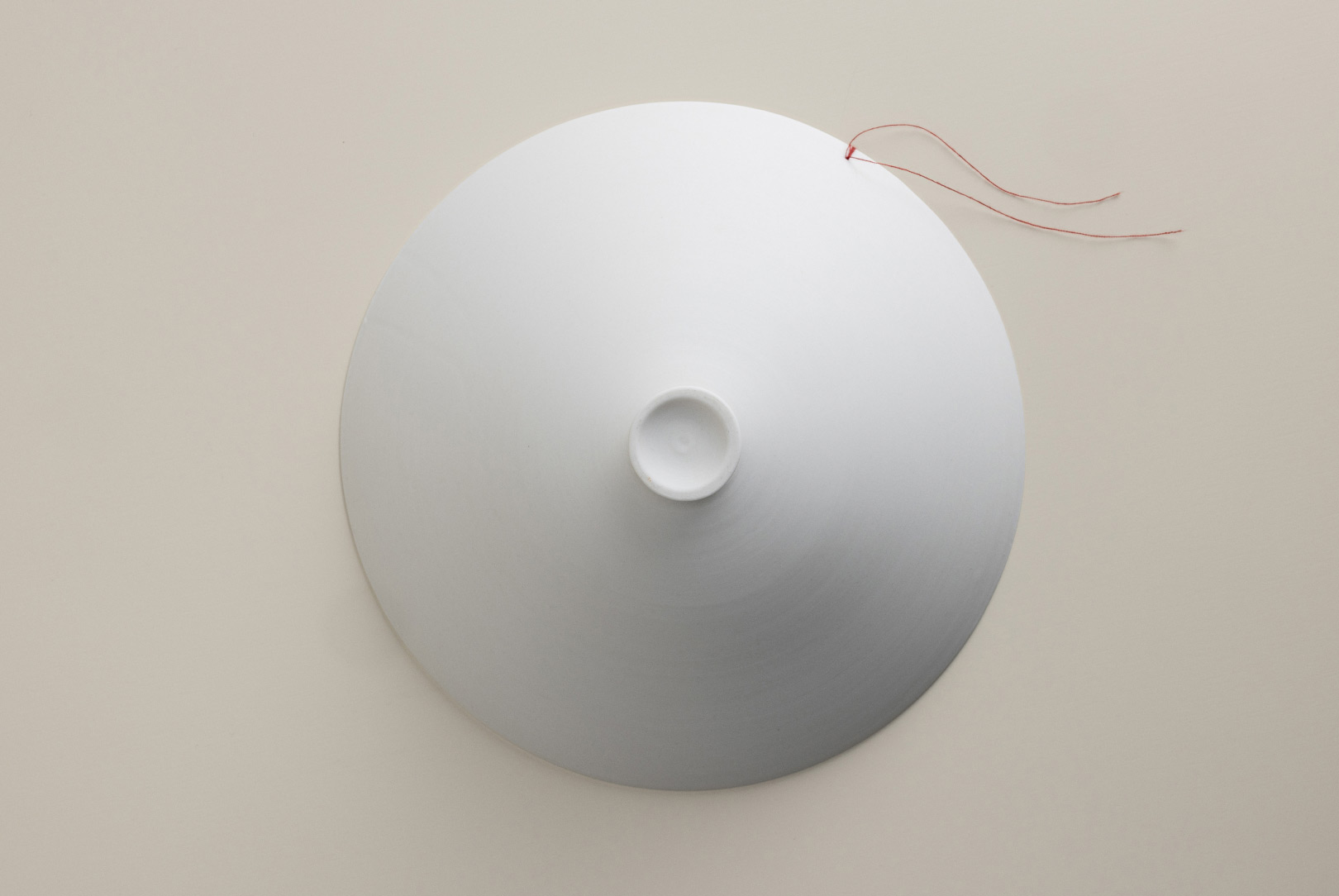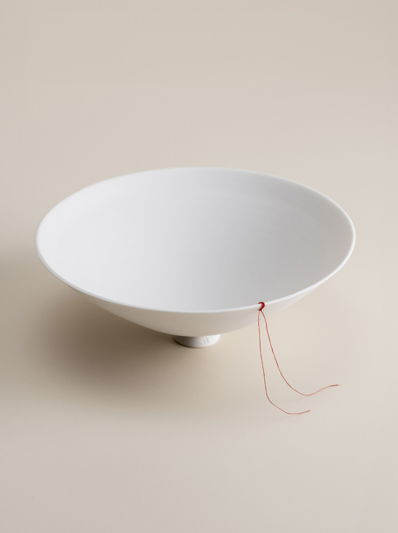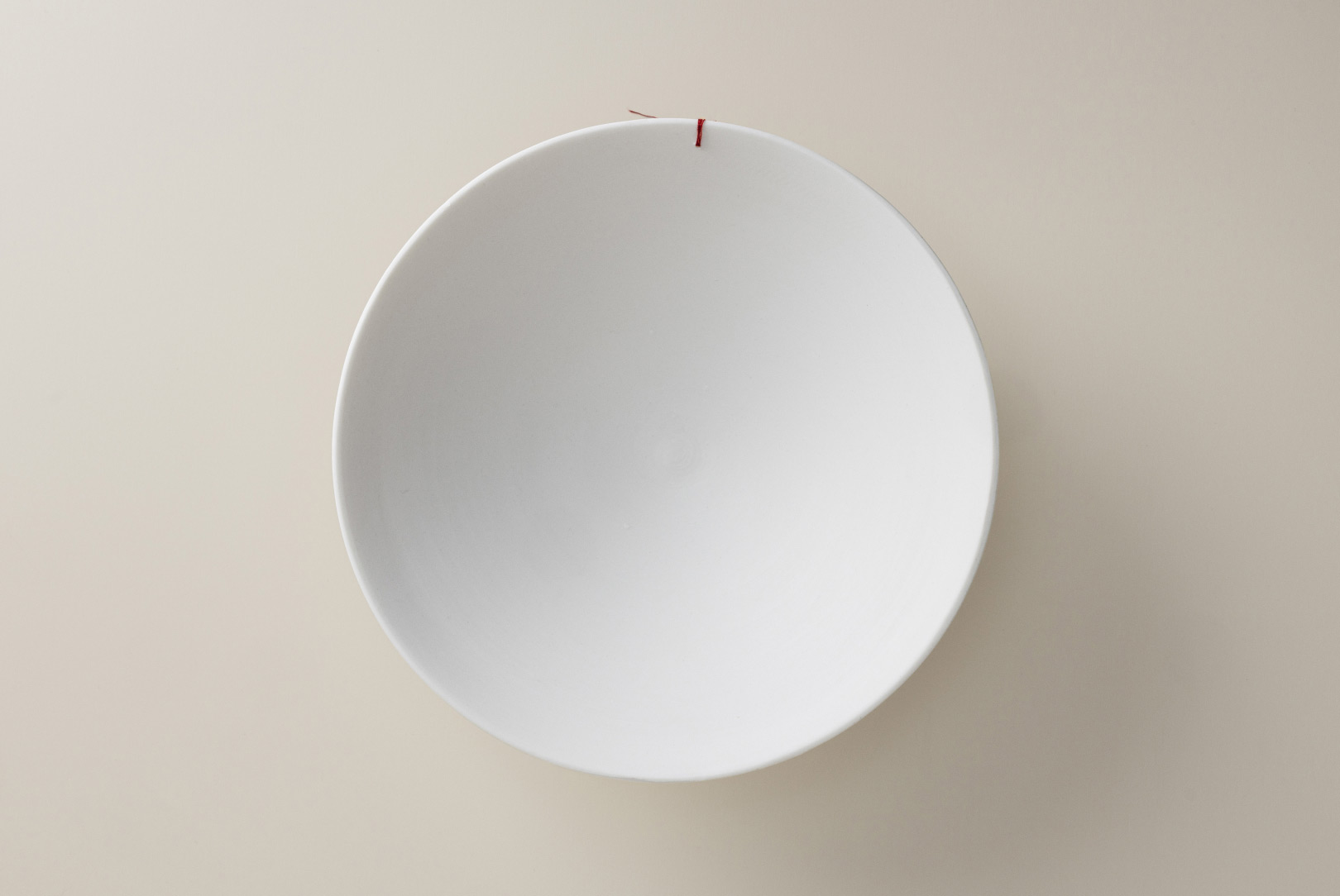 This slightly shorter version of other similar white porcelain vessels by Helga Ritsch is otherwise not smaller in any other respect. It is also translucent, and bears an even outside surface and clean lines leading down from the rim to a tiny triangular base on which it perches. A signature red thread is looped in a tiny stitch over the lip, instead of alongside it, as in some of the artist’s other vessels.
