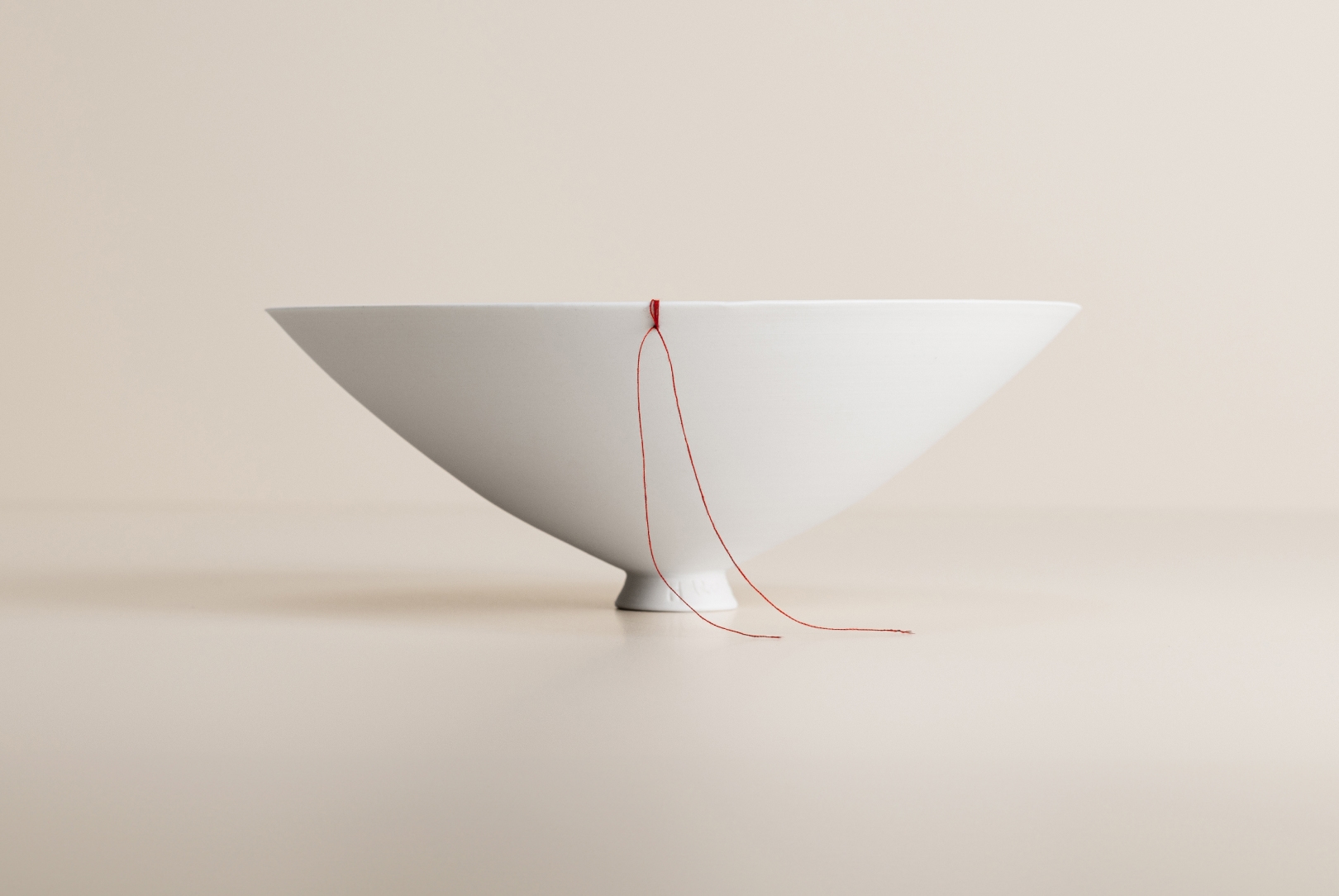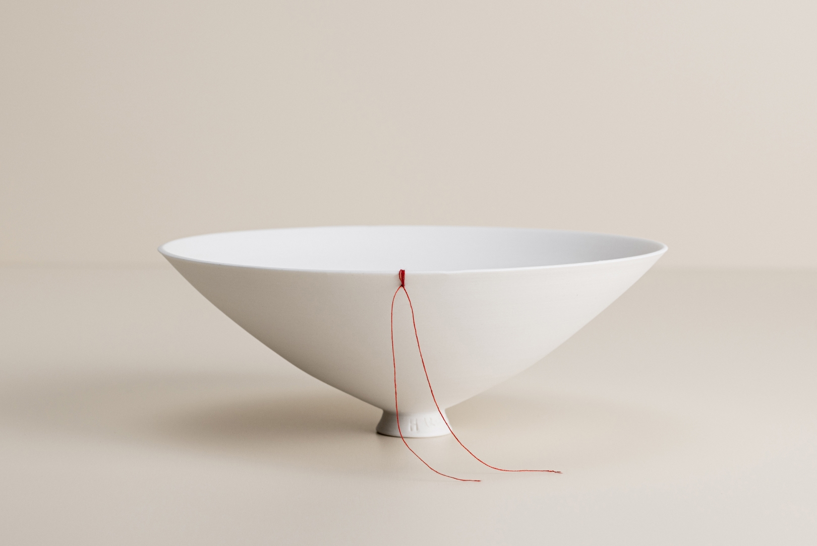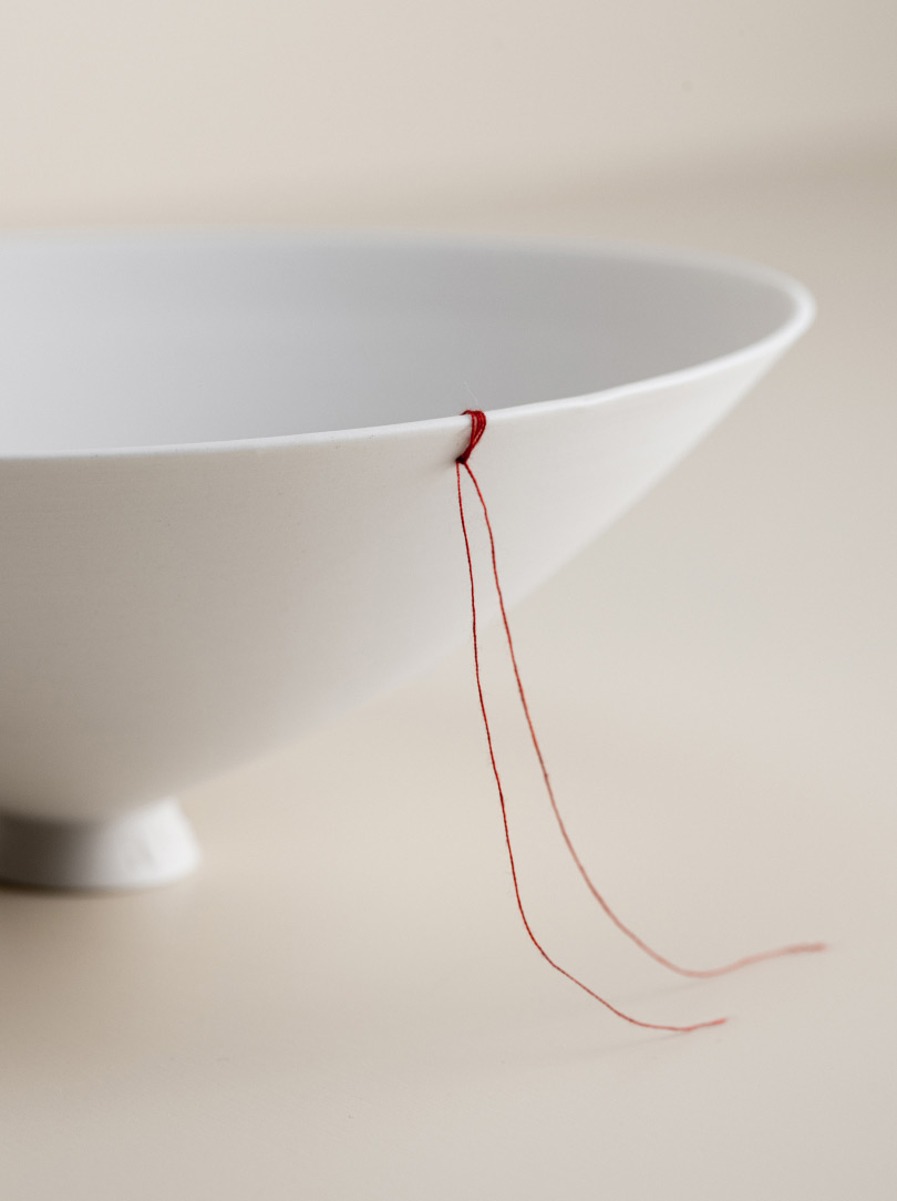 This slightly shorter version of other similar white porcelain vessels by Helga Ritsch is otherwise not smaller in any other respect. It is also translucent, and bears an even outside surface and clean lines leading down from the rim to a tiny triangular base on which it perches. A signature red thread is looped in a tiny stitch over the lip, instead of alongside it, as in some of the artist’s other vessels.