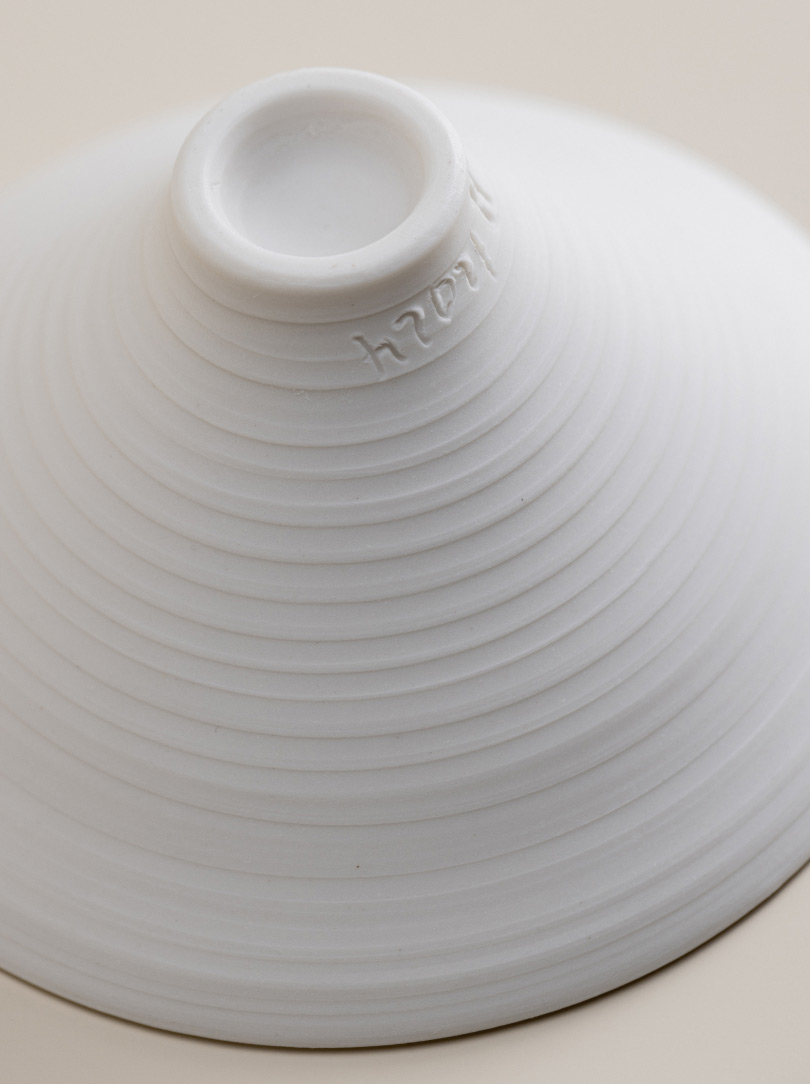 This exquisite small vessel reveals its elegance as it unfolds before your eyes and at your fingertips. Conic in shape, it rises gracefully from a small base to a larger opening, with a line so fluid it evokes silent admiration. The organic form reflects the artist’s mastery, shaping the clay with a profound sense of balance and elegance. Subtle grooves on the exterior and the imprints of Helga’s fingers in the inside are testament to Helga’s intimate connection with the material, capturing both the art and the artist in perfect harmony.