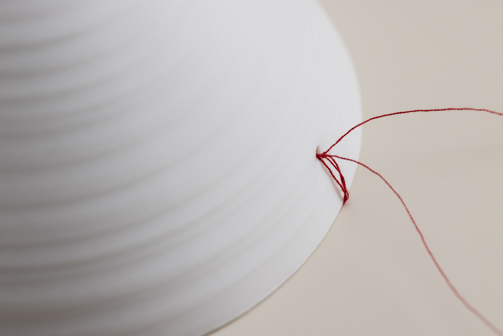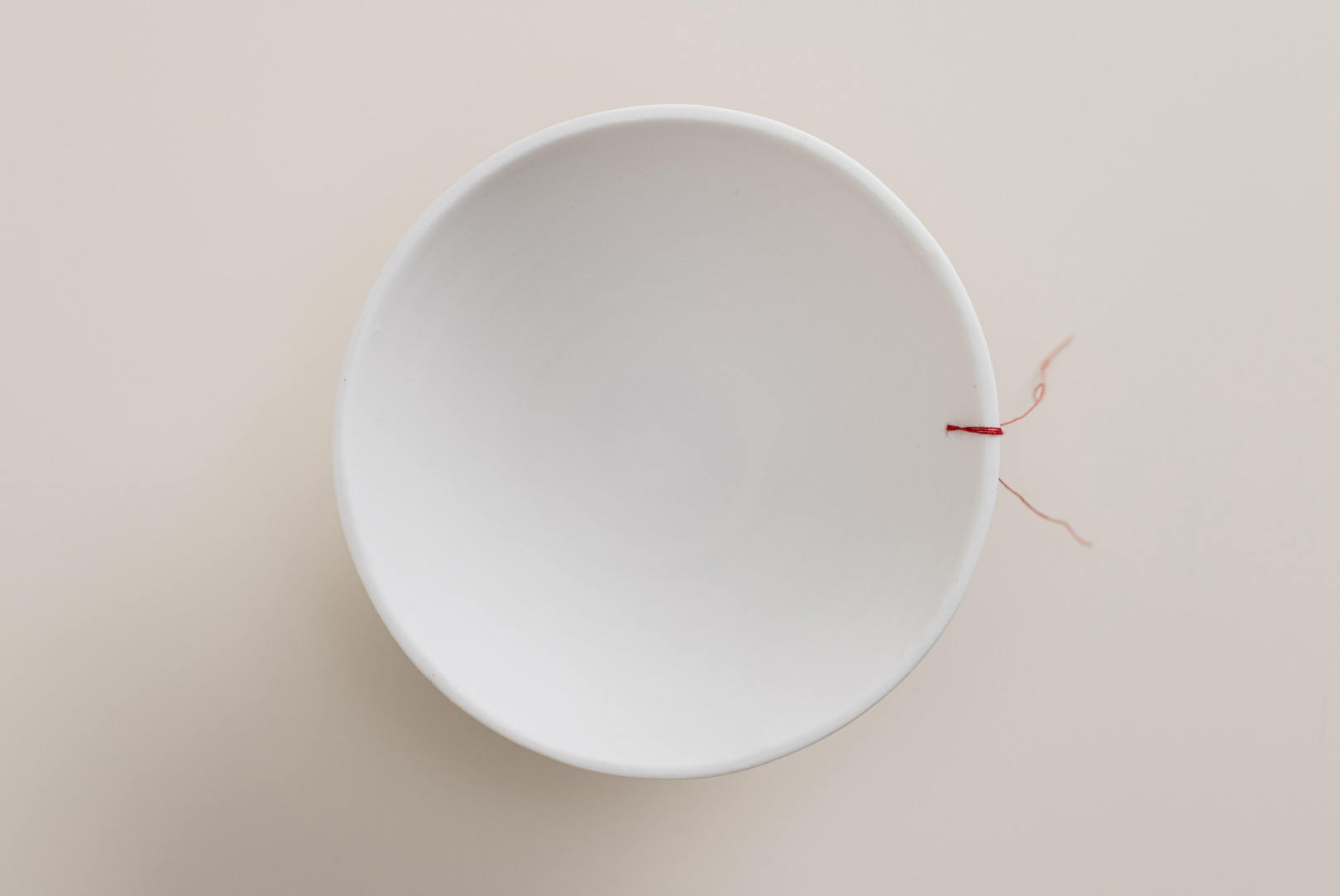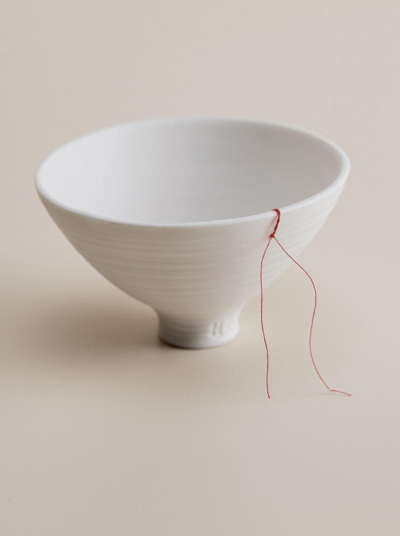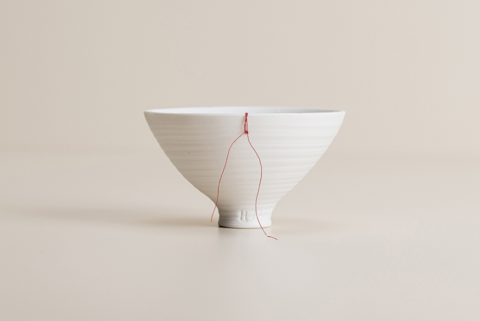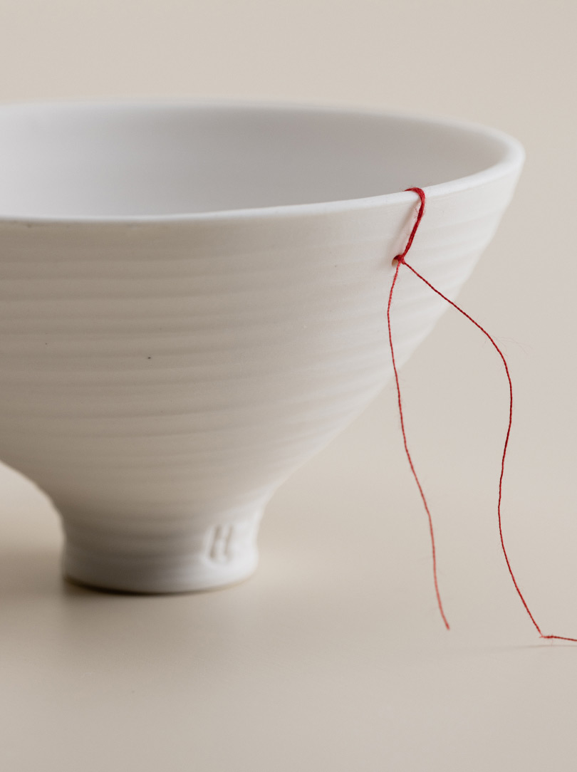 With a beautifully cupped shape and a balanced clay contour, this vessel rises from a small base to a larger opening. The border of the opening shifts in delicacy with unparalleled elegance. The organic form reflects the artist’s mastery, shaping the clay with a profound sense of harmony. Subtle grooves on the exterior and the imprints of Helga’s fingers inside are testament to her intimate connection with the material, embodying the seamless unity of art and artist. Her signature red thread is delicately stitched over the lip.