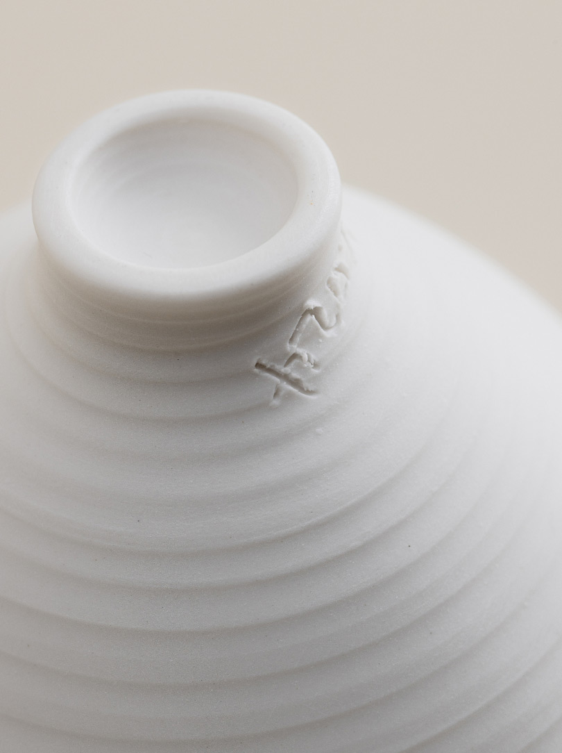 The artist used levigation, a purification method, to produce a particularly fine textured clay: this is visible on the exterior, while the inside maintains its natural state from when it was turned on the wheel.